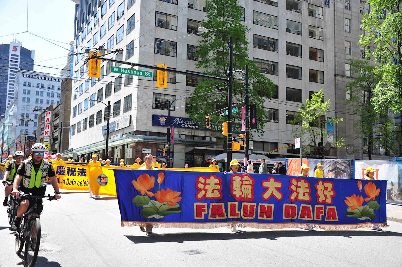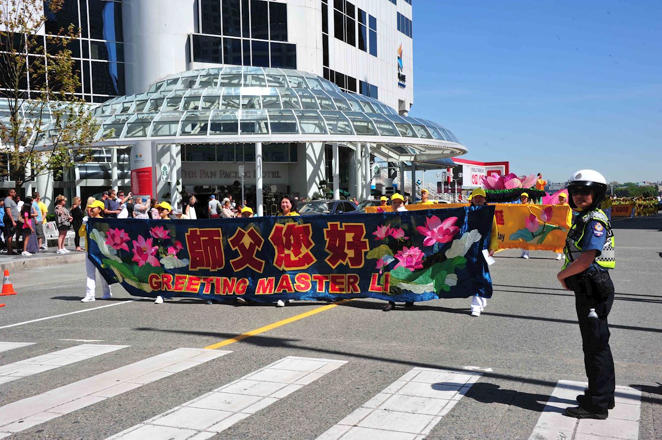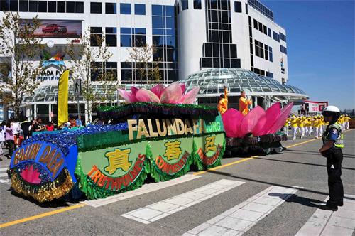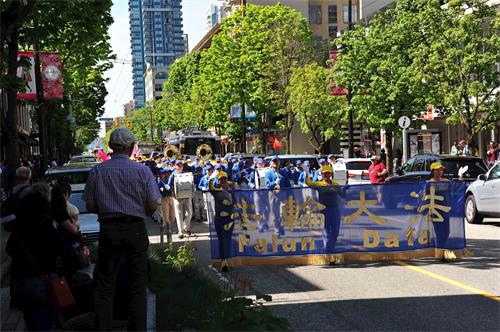 集会结束后,法轮功学员沿着市中心繁华大道游行约1小时,经过温哥华著名景点五帆酒店,温哥华冬奥火炬等景点。游行所过之处吸引了大批观众,有的用手机拍摄游行场面,有的接受了法轮大法真相资料后就地阅读,其中不少是华人观众。很多民众在车内,公共汽车内,路边窗户后面向游行的法轮功学员挥手致意。