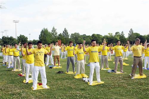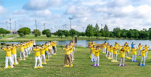 图1~3:美国达拉斯-沃斯堡地区的法轮功学员集体炼功,庆祝第十九届法轮大法日。 |