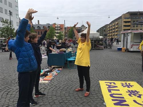 当天,丹麦学员来到哥本哈根市中心,展开“法轮大法好”的横幅后,跟随着舒缓的音乐炼五套功法。一位貌似来自欧洲中部的青年男士一边阅读真相横幅上的图文介绍,一边看学员演示功法,脸上洋溢出喜悦和期盼。一位学员上前递给他一张介绍法轮功的传单,他告诉学员,他曾听一位中国朋友说过,练气功对身体好。学员于是给他介绍:法轮大法于二十六年前的五月十三日,从中国长春传出,教人以“真、善、忍”为日常工作生活的行为标准,对强身健体有奇效,而且可提升人的道德境界,使无数人身心受益,至今弘传全世界近八十个国家和地区。这位男士兴致勃勃地听着,突然脱口道:“我知道为什么一到这儿就感觉和你们很熟悉,我知道以前就认识你们,知道自己曾和你们一样也炼过这个(功)。请再给我一份法轮大法介绍会的简介好吗?我很想给那位中国朋友。因为这个功法真是很好,真好……”他说着,不禁走到展示功法的学员中间,也随着舒缓的音乐炼起了功法动作 。