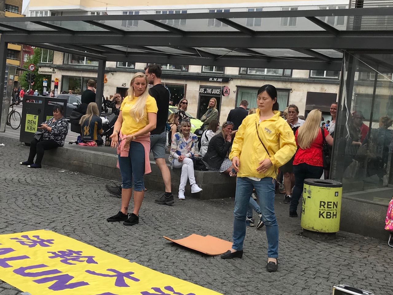 图1:二零一八年五月十二日,丹麦法轮功学员在哥本哈根市中心展示功法,向世人传递真善忍的福音。