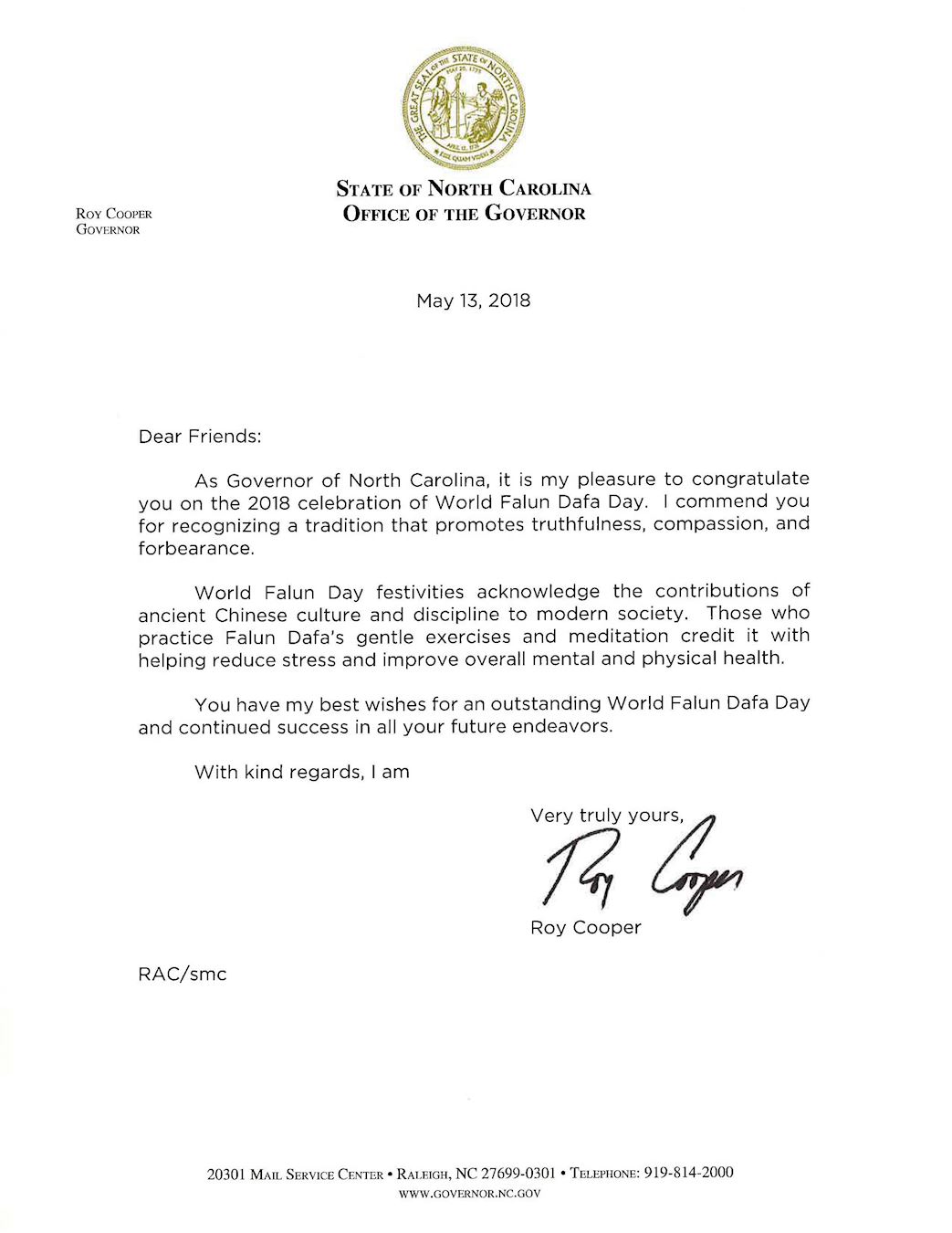 北卡州长罗伊·库珀(Roy Cooper)在贺信中写道:“作为北卡州州长,我很高兴的祝贺你们举办二零一八年世界法轮大法日的庆典,我赞扬你们坚持促进‘真、善、忍’的传统价值。世界法轮大法日的庆祝活动以中华传统文化和价值对现代社会做出贡献。平和的法轮功功法和静坐可以帮助减轻压力并改善整体的身心健康。我向你们致以世界法轮大法日最美好的祝愿,并祝你们在未来继续取得成功。”