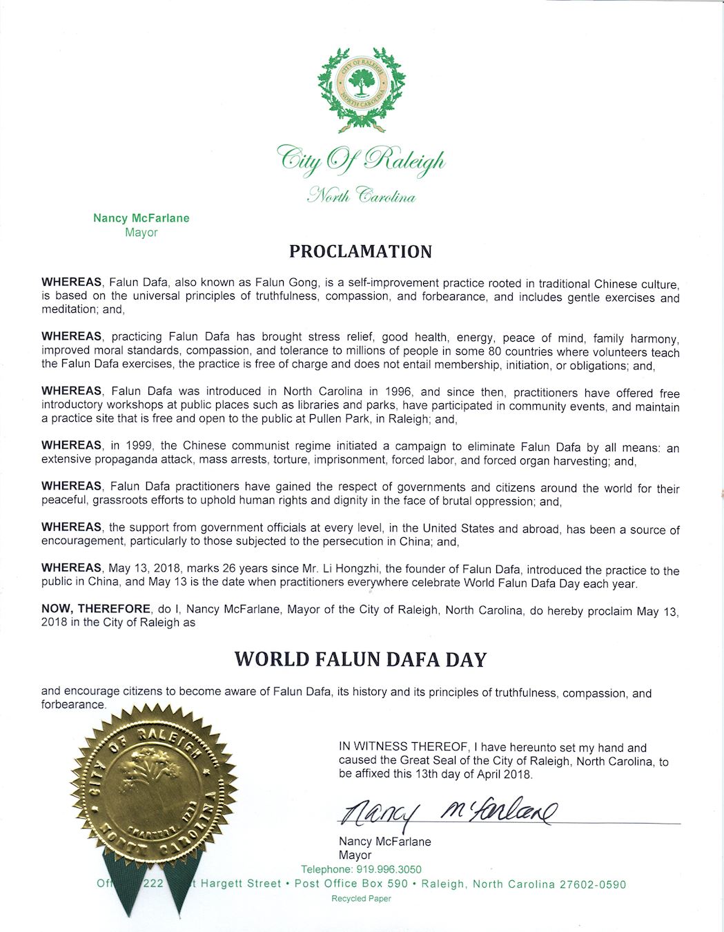 现在,因此,我,南西麦克法兰,北卡罗利市长,二零一八年在此宣布五月十三日为罗利市的世界法轮大法日,鼓励民众去了解法轮大法的历史和“真、善、忍”的价值。