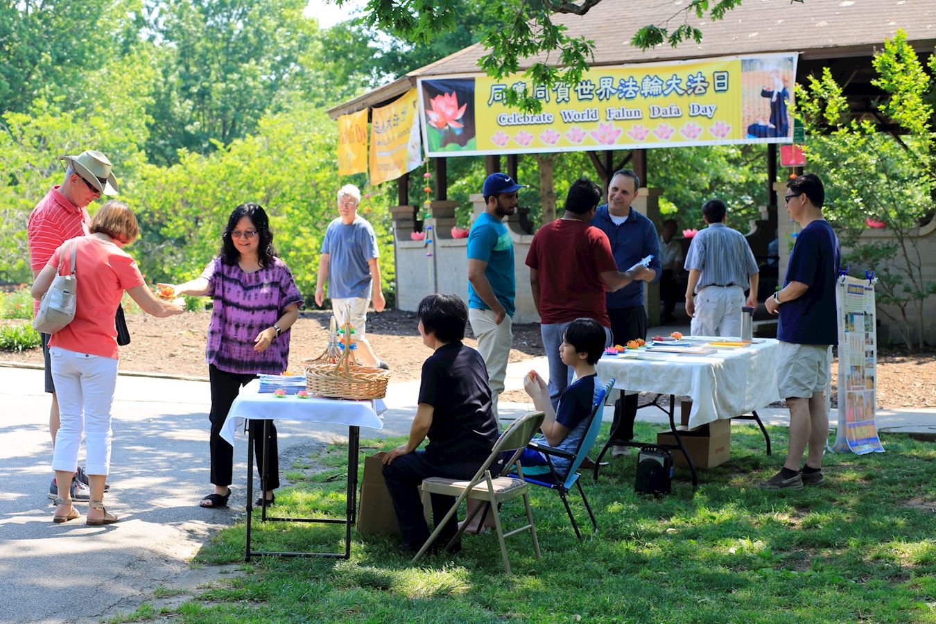 图5:北卡州法轮大法学员举办“世界法轮大法日”庆祝活动,图为学员在向人们介绍法轮大法