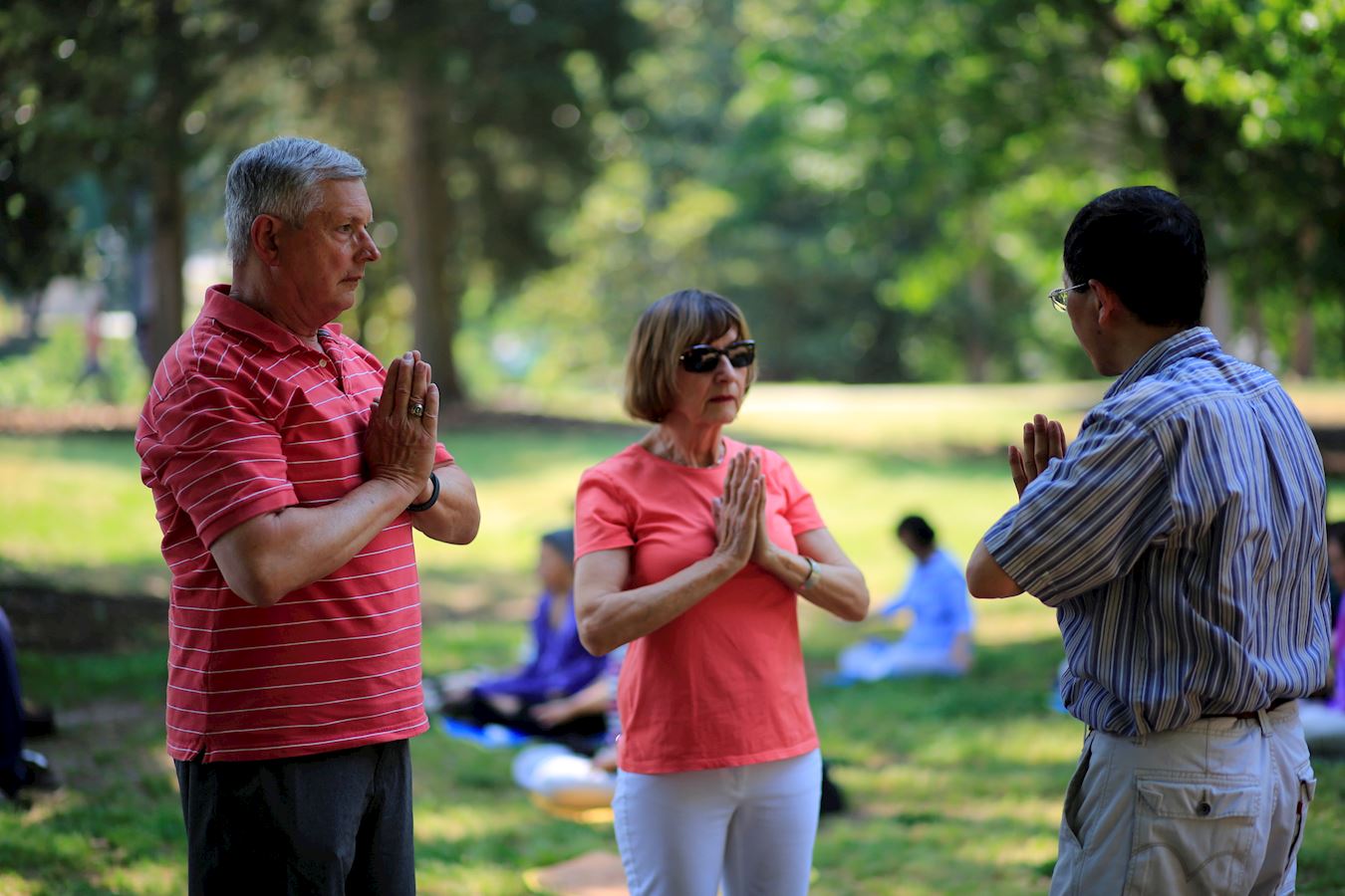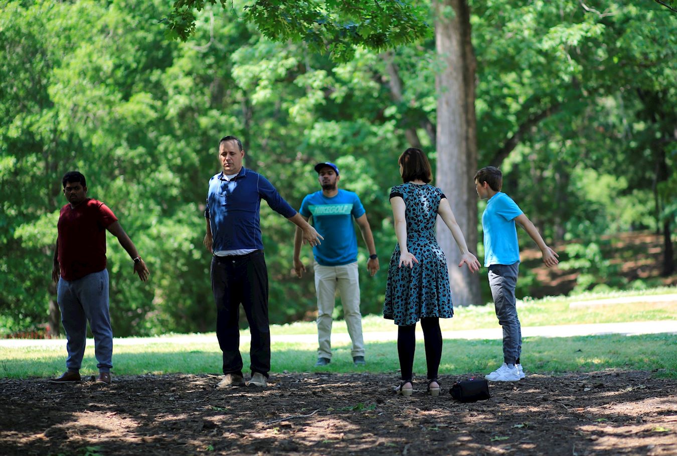 来自北卡州各地区的部份法轮大法学员,随着悠扬的炼功音乐,整齐祥和的演炼着五套功法。闻讯而来的民众或是驻足相观,或者直接加入了炼功的行列。当天来学功的人络绎不绝,学员们细心地为人们讲解,并一招一式教他们学炼。许多人在学功后感到内心非常平静祥和,愉悦的与学员们分享他们内心的感受。