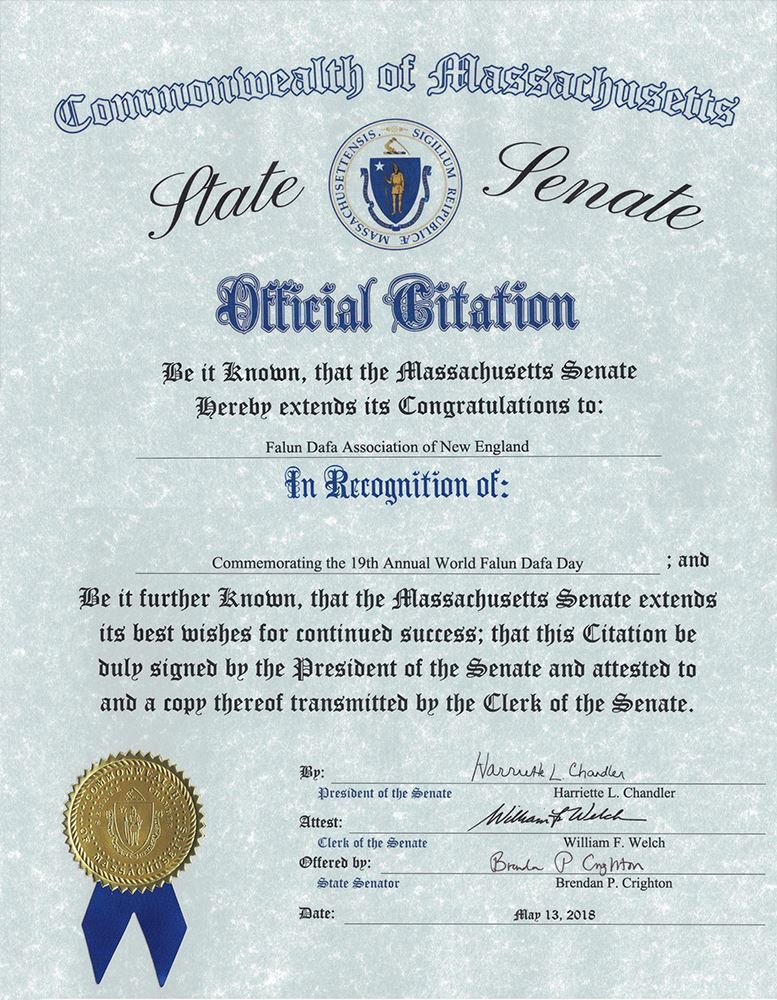 麻萨诸塞州参议院褒奖新英格兰法轮大法学会