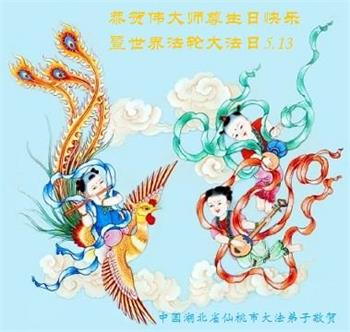 湖南省长沙市大法弟子家属在贺词中表示:“师尊华诞快乐!祝全世界大法弟子5.13大法日快乐!我和媳妇,儿子暂未修炼,但是我们对李洪志大师尊敬和感恩,所以我们敬称师尊,我们经常念法轮大法好,真善忍好,在师尊法像前问候师尊好,并拜谢师尊的救度洪恩。
