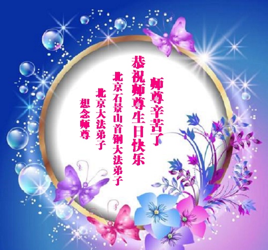 我们借助北京大法弟子的手、借助明慧网平台,翻墙向慈悲伟大的李洪志大师恭祝生日快乐!盼师尊早日回归中原神州,恩泽百姓、佛光普照神的子民,我们跪叩俯首,静等师尊归来!法轮大法好!北京中轴线百姓叩首。”