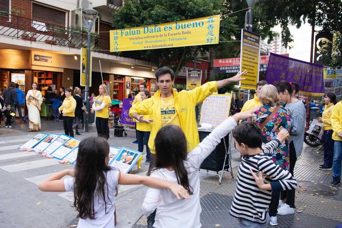 从二零零三年开始,这十五年以来,阿根廷的法轮功学员每周末都在华人街展示功法、传播真相。尽管刚开始时受到来自中领馆的各种干扰,包括中共收买流氓对法轮功学员进行挑衅、殴打、抢横幅,欲用各种流氓手段阻止、干扰学员讲真相;不过,通过阿根廷学员持续不懈的努力,坚持来此向各界民众讲述大法的美好,揭露中共的邪恶,越来越多人明白了真相,现在的华人街,中共的势力再嚣张不起来了。学员每个周末都来此挂真相横幅,展示功法,跟民众讲述大法的真相,再也没有任何干扰。而大法学员设立的真相点已成为布宜诺斯艾利斯市华人街不可缺的一道风景。