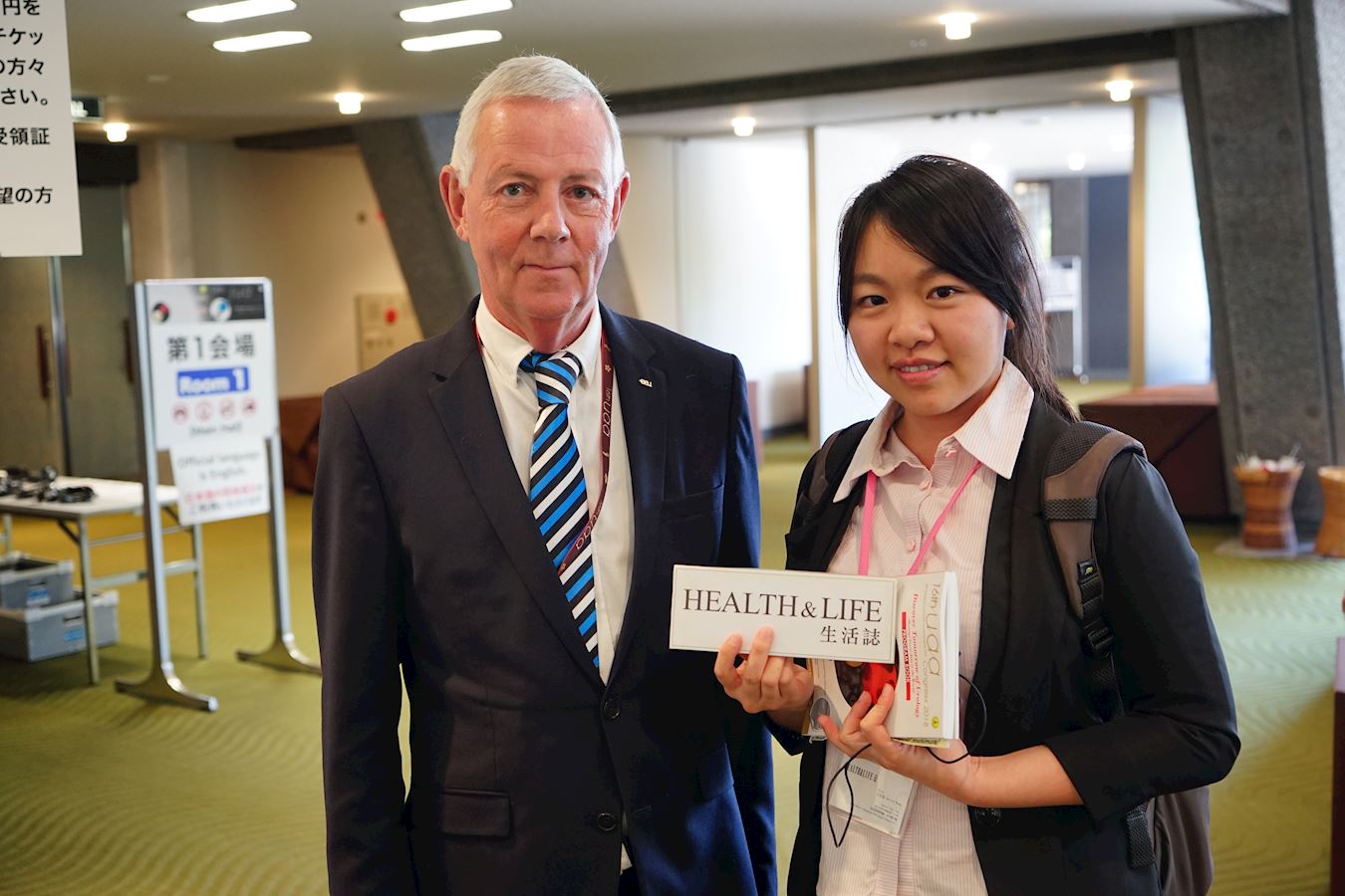 ![]() 图3:日本医疗器材公司执行董事海平和男(左)和台湾国际器官移植关怀协会秘书长黄千峰(右)合影表达支持 |