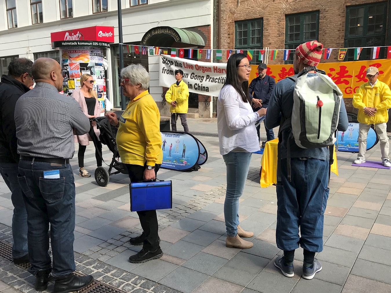 一个二十多岁的小伙子,认真读完传单后与法轮功学员聊了起来。他说他以前未注意过法轮功,很高兴今天有缘了解了法轮功和迫害真相,并表示对在中国发生多年的迫害感到不可思议。他不能理解这样的一个使人强身健体,并提升人们道德的功法会被禁止甚至被迫害。他本人对打坐很感兴趣。交谈中,学员告诉他法轮功是高德大法,不只是简简单单的练练动作,其内涵很深,并介绍他可以通过读法轮功的著作来了解其内涵。这个小伙子马上借了《法轮功》这本书,在一旁浏览了起来。过了好一会儿,他找到那位学员说这本书很好,随即买了一本。他再三强调:“这就是我要找的!”