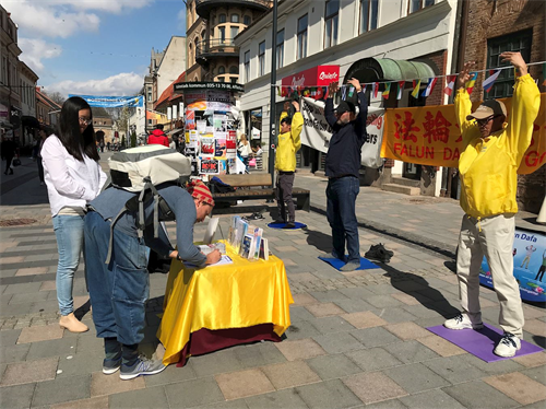 活动期间,法轮功学员伴随着悠扬的炼功音乐在港市国王街上展示着功法。过往的人们纷纷驻足,有的观看,有的与学员交谈,有的仔细阅读传单,有的不禁随着音乐学做着炼功动作,还有的主动到展桌上的签名簿上签名,支持法轮功学员反迫害。
