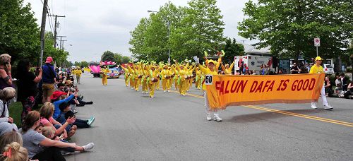 5月19日,天气凉爽,十分适合户外活动。法轮功学员的游行队伍包括腰鼓队、“真善忍”花车等,一如既往受到观众热烈欢迎。很多人是第一次看到法轮功学员的游行队伍,他们在欣喜之余纷纷拿了相关资料,有的在现场看完真相资料后,将资料细心放入包中以备以后阅读,有的一边看资料,一边念着“法轮大法”,“真善忍”。