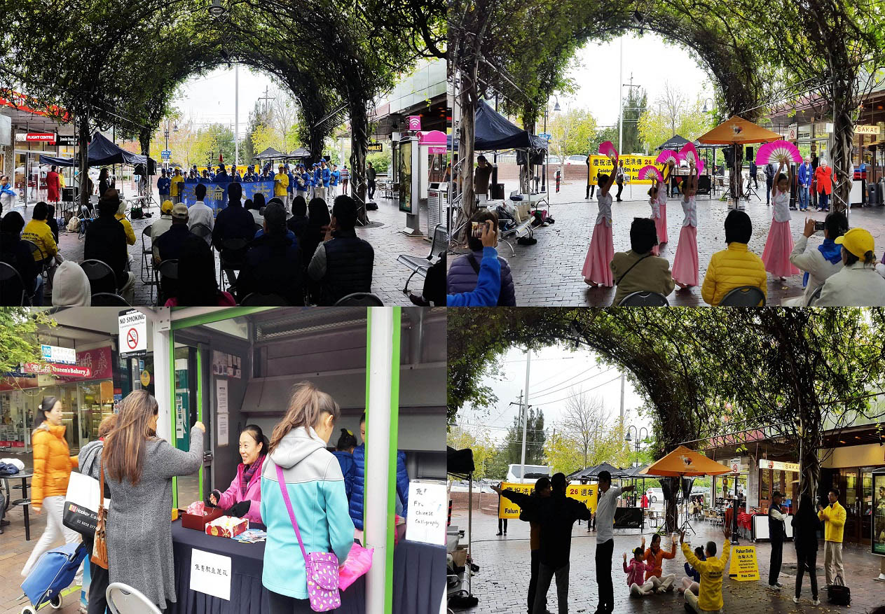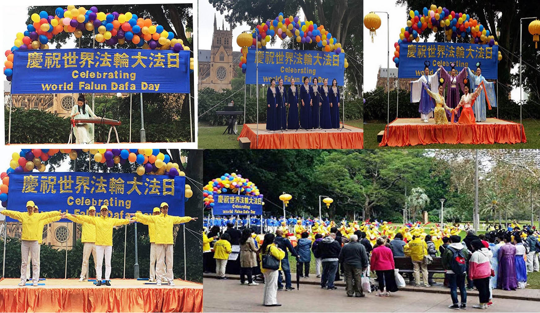 从五月五日清晨,法轮功学员以在悉尼市中心举行大型的五套功法演示、游行与拍照向师父恭祝华诞来拉开今年庆祝活动的序幕。随后的两周内,持续在十多个地区展开各种丰富多彩的欢庆活动,包括悉尼市中心重要商业地区马丁广场(Martin Place)、海德公园(Hyde Park)、贝尔莫公园(Belmore Park)、Ashfield、Burwood、Cabramatta、Campsie、Eastwood、Hornsby、Hurstville和Parramatta等地区举行大、中、小型法轮功五套功法演示、免费教功、折叠莲花、中国书法撰写、载歌载舞,表演多姿多彩的传统文艺节目等,向世人颂扬法轮大法的美好,表达他们对慈悲师父的感恩。庆祝活动受到各地民众的支持,赢得欢呼和赞誉。