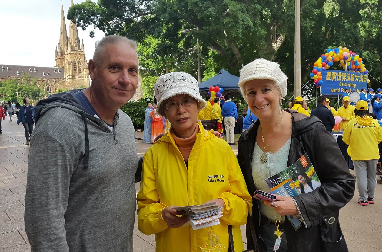 从黄金海岸来悉尼旅游的莫蒂默(Mortimer)夫妇看到那么多人聚集在海德公园(Hyde Park)欢庆,他们非常高兴地站在那边观看。他们表示本来不知道法轮功是什么,法轮功学员海伦(Helen Chan)向他们述说了自己亲身经历被中共非法迫害的详情,莫蒂默夫妇表示:“我们真的非常震撼和感动,希望她把这么生动详细的被迫害经历写成书让更多人知道;希望澳洲政府能够关注并保护这些从中国大陆出来的法轮功学员;并尽快帮助制止这场惨无人道的迫害。”