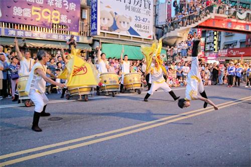 华灯初上时,游行展开,抽中第七队出场的新!唐!人:台湾旗鼓队,震撼的鼓声,搭配威风凛凛挥舞的大旗及身手矫健的翻腾,吸引了众人的目光,并响起如雷的掌声,连主持人都不禁赞叹演出者的身段深具中国古典舞的底蕴。