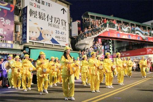随后第二十队出场的苗栗腰鼓队,更让大家眼睛为之一亮,呼应今年活动“舞灯靓”主题,镶上灯串的“法轮大法”横幅及“真、善、忍”字样愈加醒目,仙女队提着传统手工制作的“真、善、忍”花灯,引领后方在灯串妆点下也是一身金光闪闪的苗栗腰鼓队,呈现精彩的演出,吸引民众夹道欢迎,连声赞好!