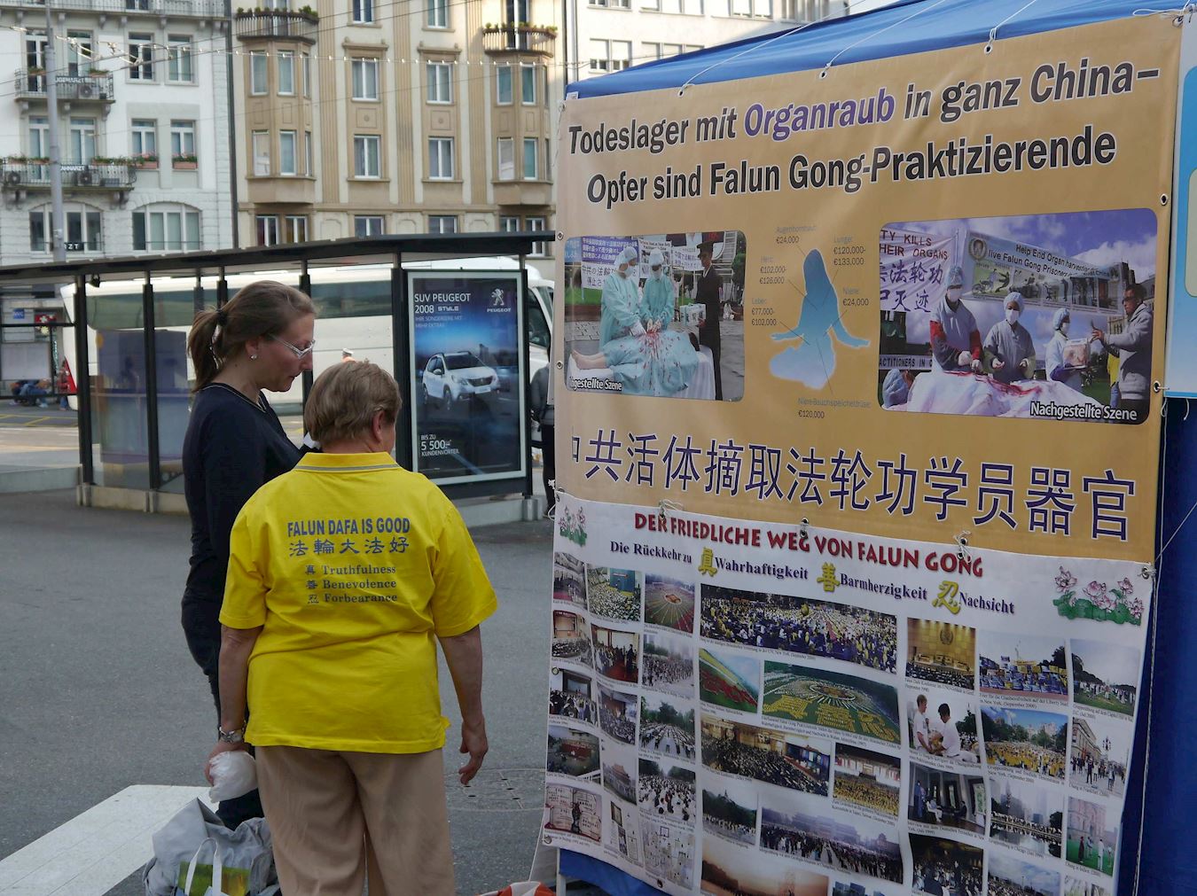 衣着得体的洛丁(Luedin)女士经常看到法轮功学员设立的信息摊位,但能有时间仔细阅读展板上的内容还是第一次。虽然她一般不在公众场合参与征签,但是在看了揭露中共活摘罪行的信息后,她立即签名要求制止这一罪行,并鼓励其他路人也签名表示支持。