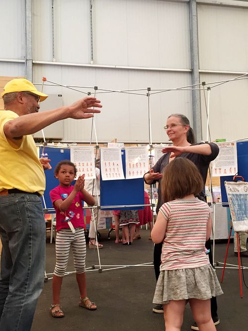 四天的展览会上,来法轮功展位的参观者络绎不绝,一些参展人也前来学炼法轮功。要求现场学功的人很多,教功的学员常常应接不暇。但人们都很满意,拿走了法轮功传单,上面有法轮功网站地址,可以免费下载书籍,炼功音乐,还有很多真相信息。