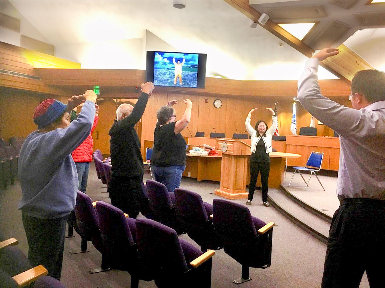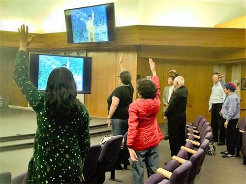 法轮功学员先用简短的录像跟来宾们介绍了什么是法轮功,以及修炼法轮功对身心的益处。之后播放法轮功创始人李洪志大师的教功录像,让新学员逐步学习五套功法。