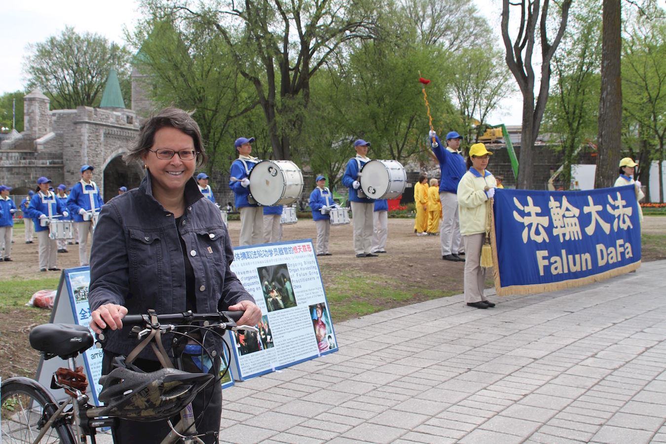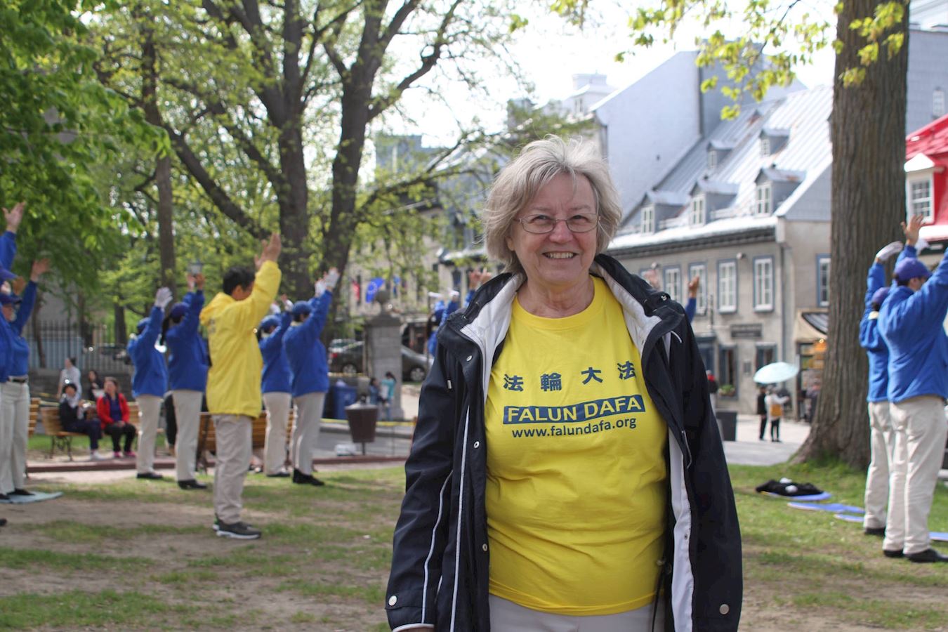 魁北克法轮功学员哈里斯·吉拉尔(Paryse Girard)女士修炼法轮大法有七年了。起初,一名修炼法轮大法的同事给了她一份传单,她看了后便阅读了《转法轮》一书,从此她就和母亲伊迪·丝萨瓦德(Edith Savard)一同走上了修炼道路。