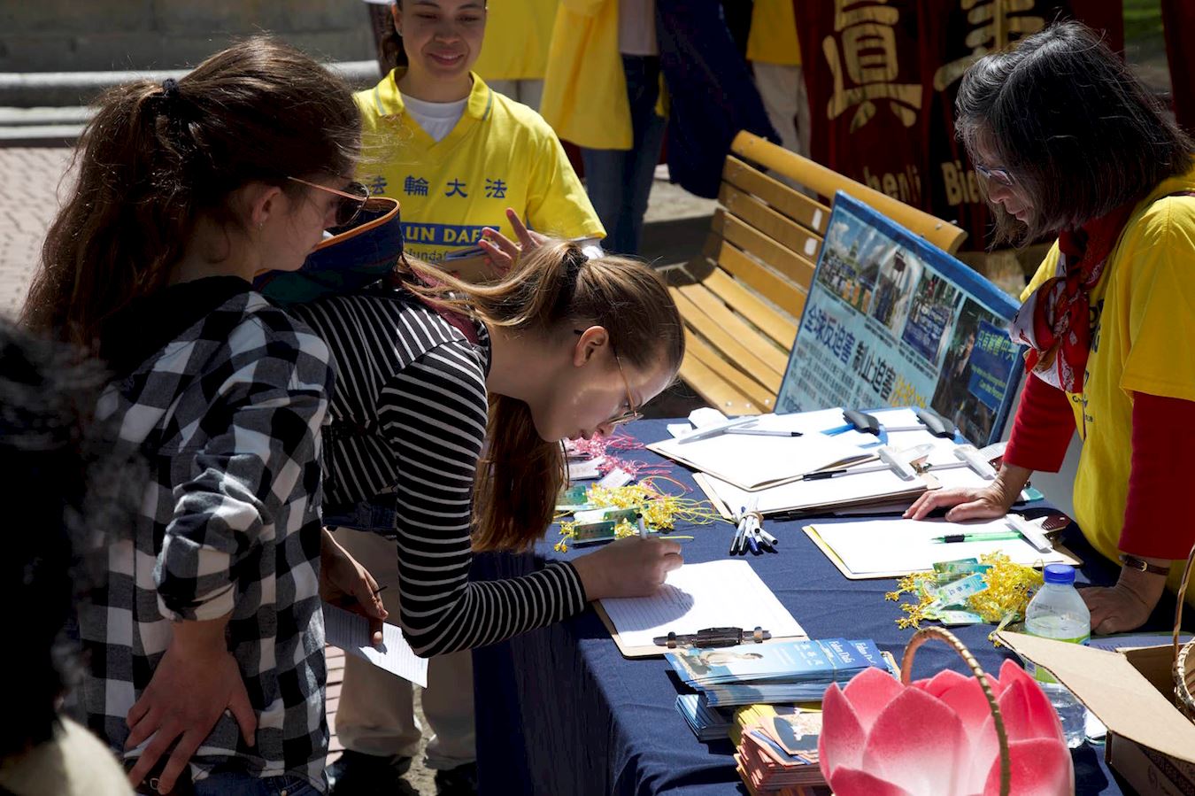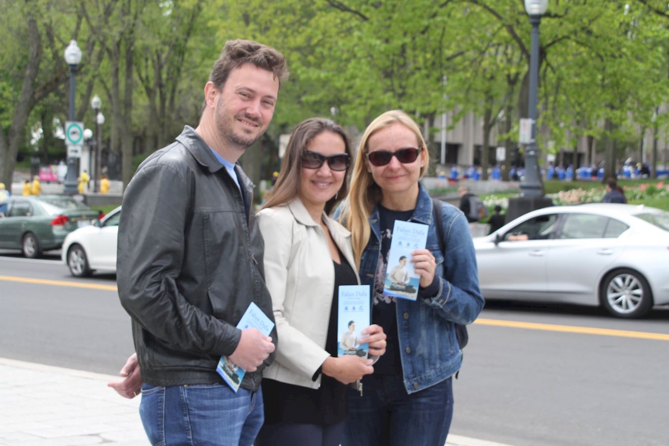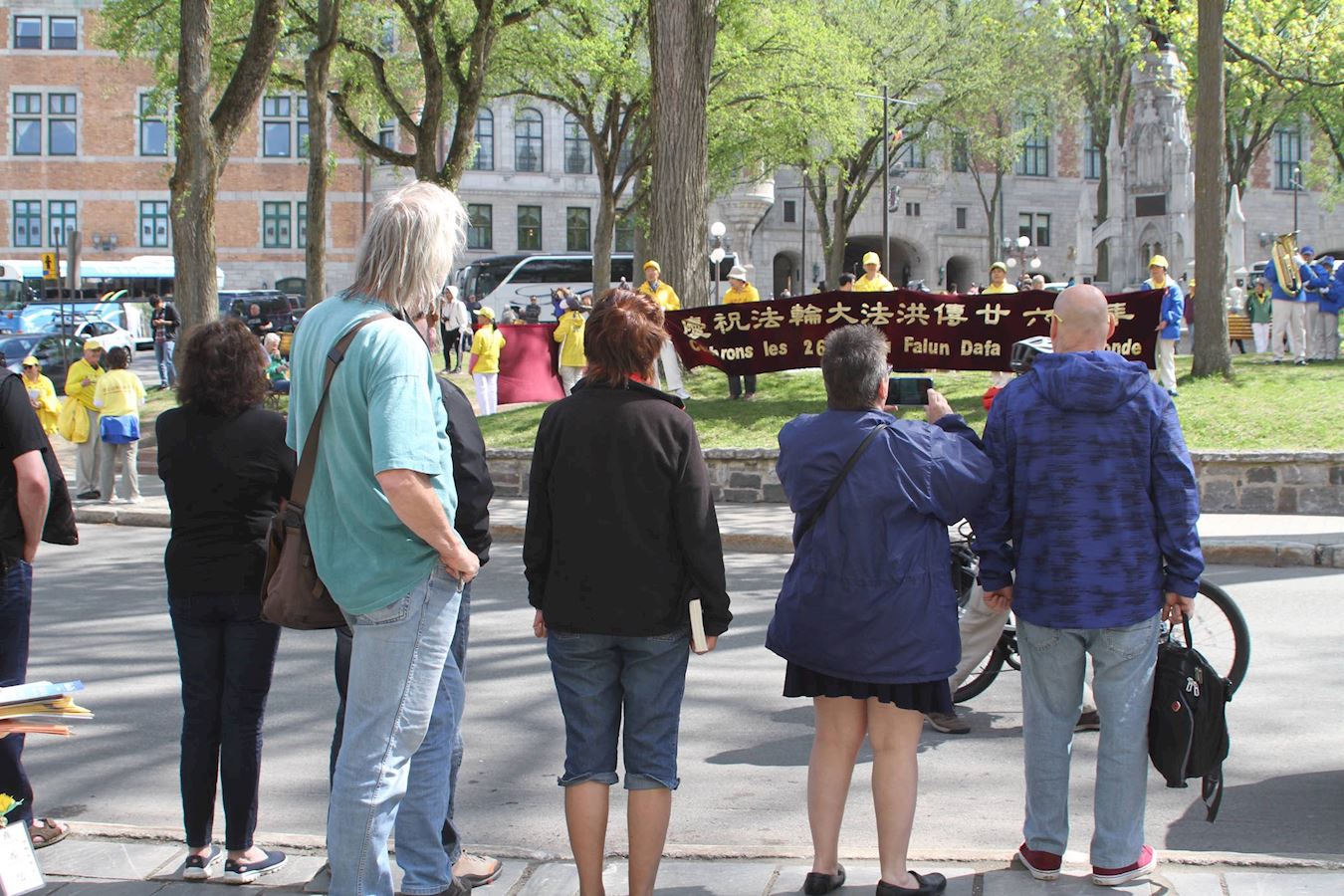 在拉瓦尔大学(Laval)短期实习的波兰女孩维罗尼卡(Veronica),看到游行队伍经过,从法轮功学员手中接过传单和象征着吉祥的莲花挂件。她说:“我要把这个传单发给我的中国朋友看,我从传单上看到,这是个打坐的功法,而且是免费的,每个人都可以学。”当她看到传单上介绍法轮功在中国遭受迫害时表示:“这很糟糕。”