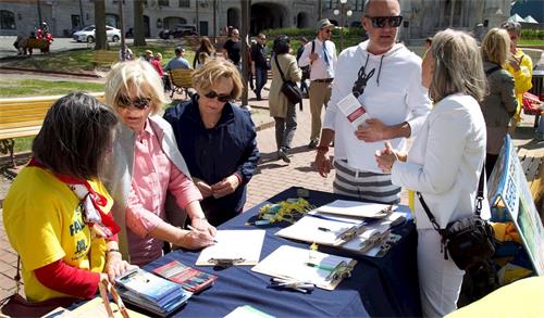 普罗(Provencher)先生一家三口聆听了集会上一名来自中国大陆、曾屡遭残酷迫害的法轮功学员发言之后,非常同情法轮功学员在中国的遭遇,前往制止活摘的征签信上签名。