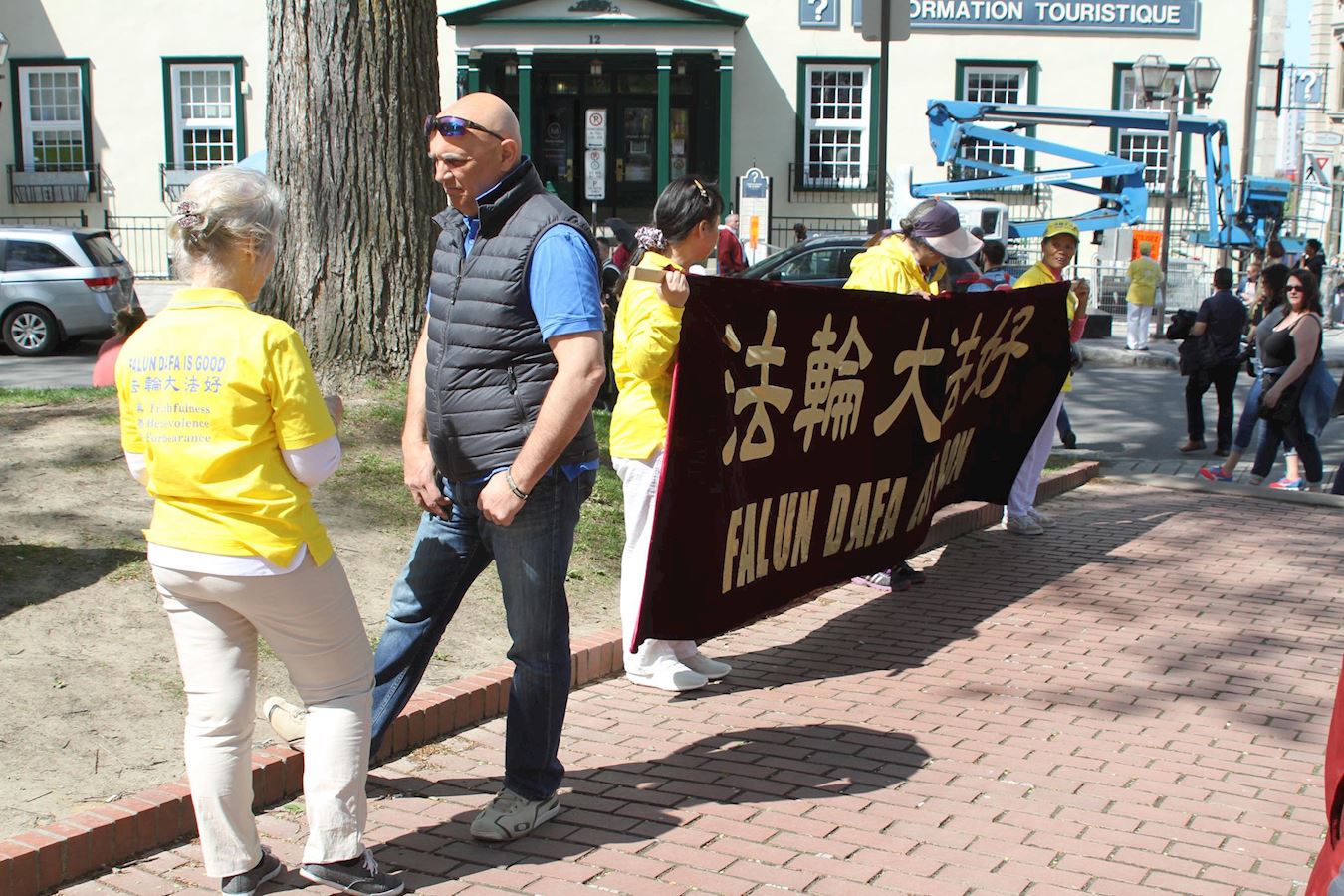 ![]() 图4:魁北克退休医生马丁在游行出发点表示支持法轮功学员。 |