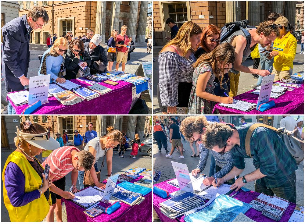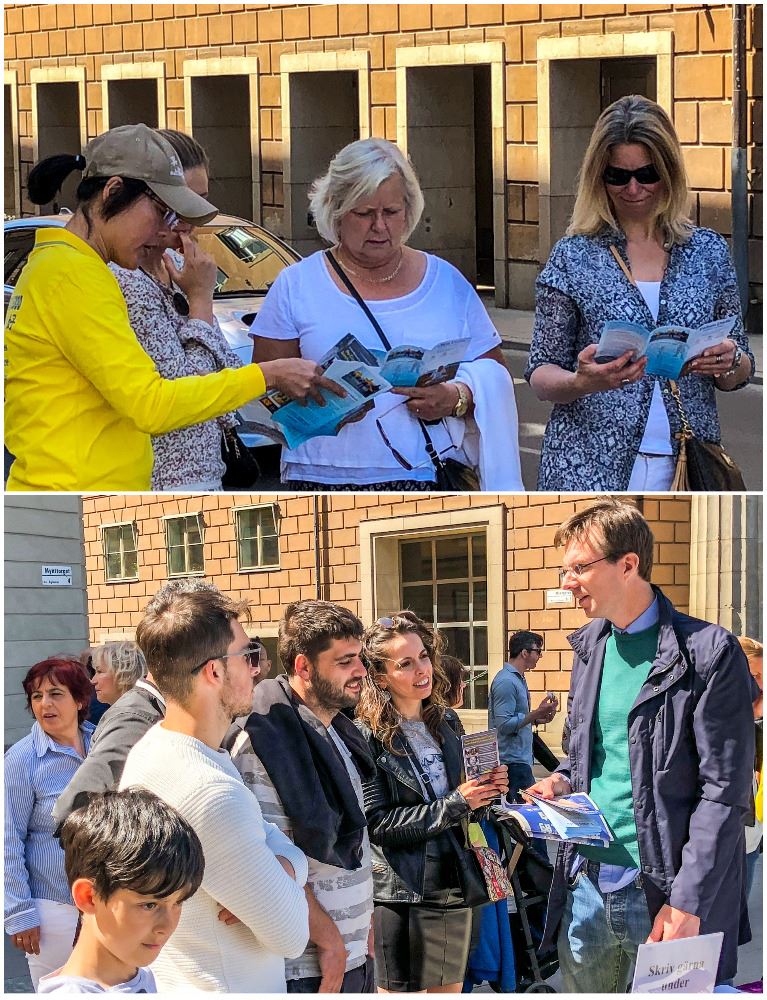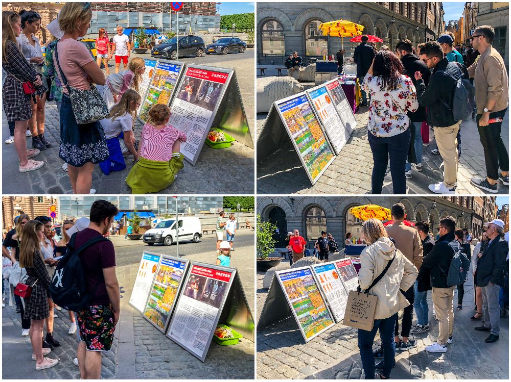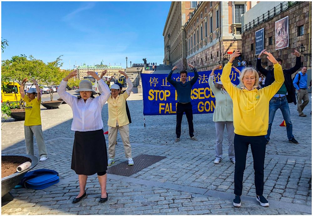 ![]() 图1:瑞典学员在位于瑞典国会大厦和皇宫之间的钱币广场上,举办揭露中共迫害、讲真相活动。学员们在演示祥和的五套功法,向过往民众展示法轮大法的美好。 |