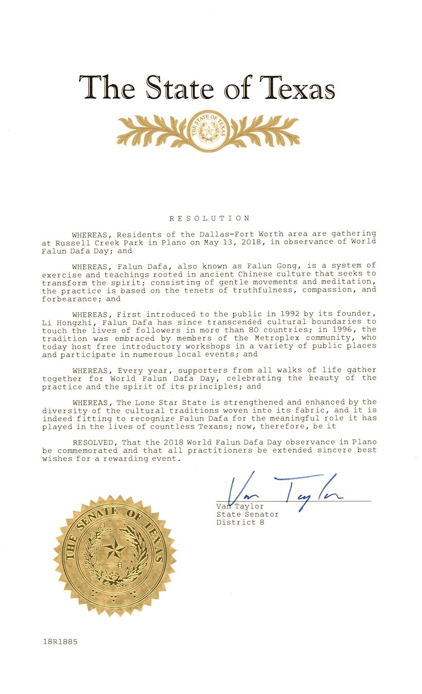 德州州参议员万·泰勒(Van Taylor)颁发了决议案,庆祝世界法轮大法日。以下是议案译文。