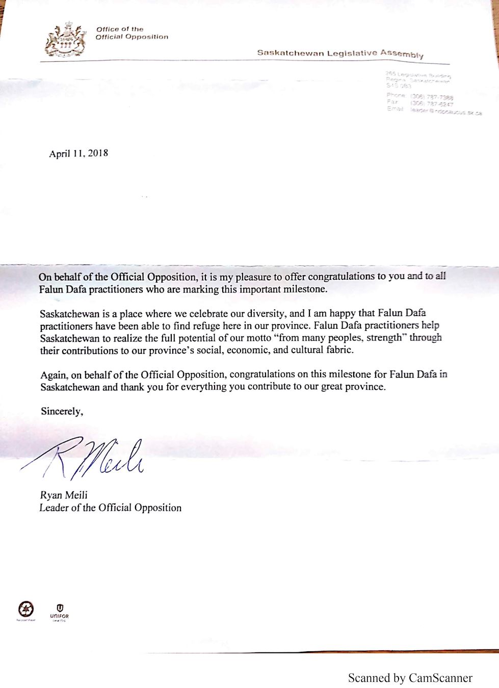 “谨代表反对党,祝贺法轮大法在萨斯喀彻温创下的这个里程碑,感谢你们为我们伟大的省作出的贡献。”