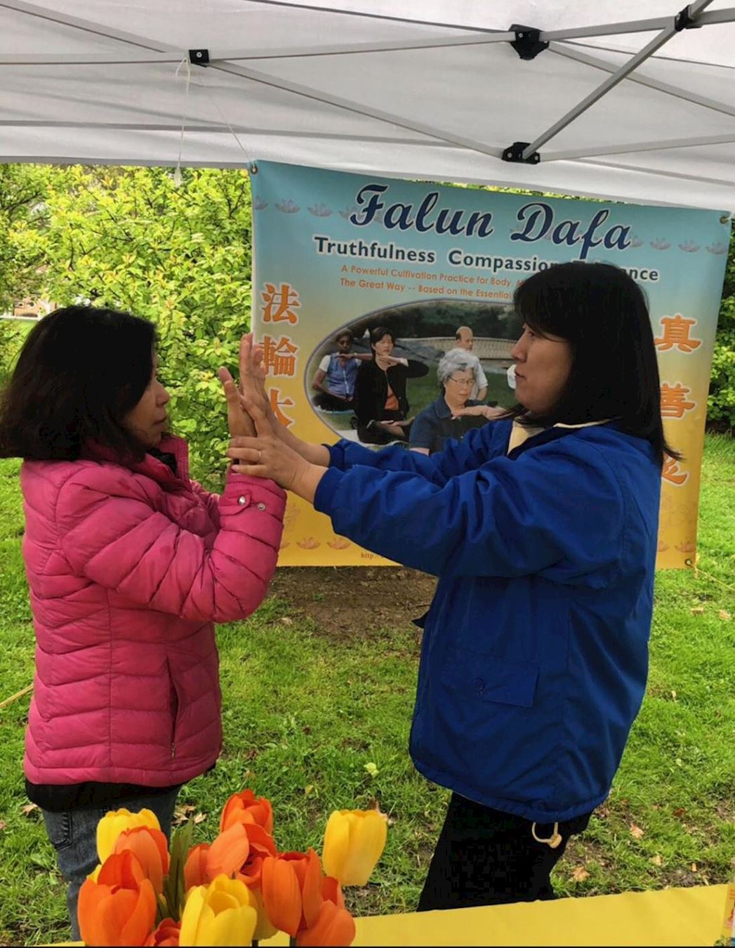 尽管周六(12日)风雨交加,气温骤降,一位台湾女士仍然如约来到法轮功学员的展台,认真跟学员学炼功法。她曾与一位法轮功学员在中国超市偶遇,彼此立刻觉得面熟,交谈中才知道从未见过。学员给她介绍法轮功,她马上表示想学,并约定前来郁金香节学功。