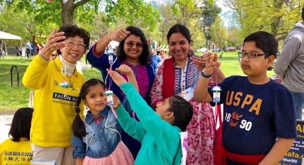 ![]() 图4:拿到法轮功传单和精致小莲花的人们非常高兴 |