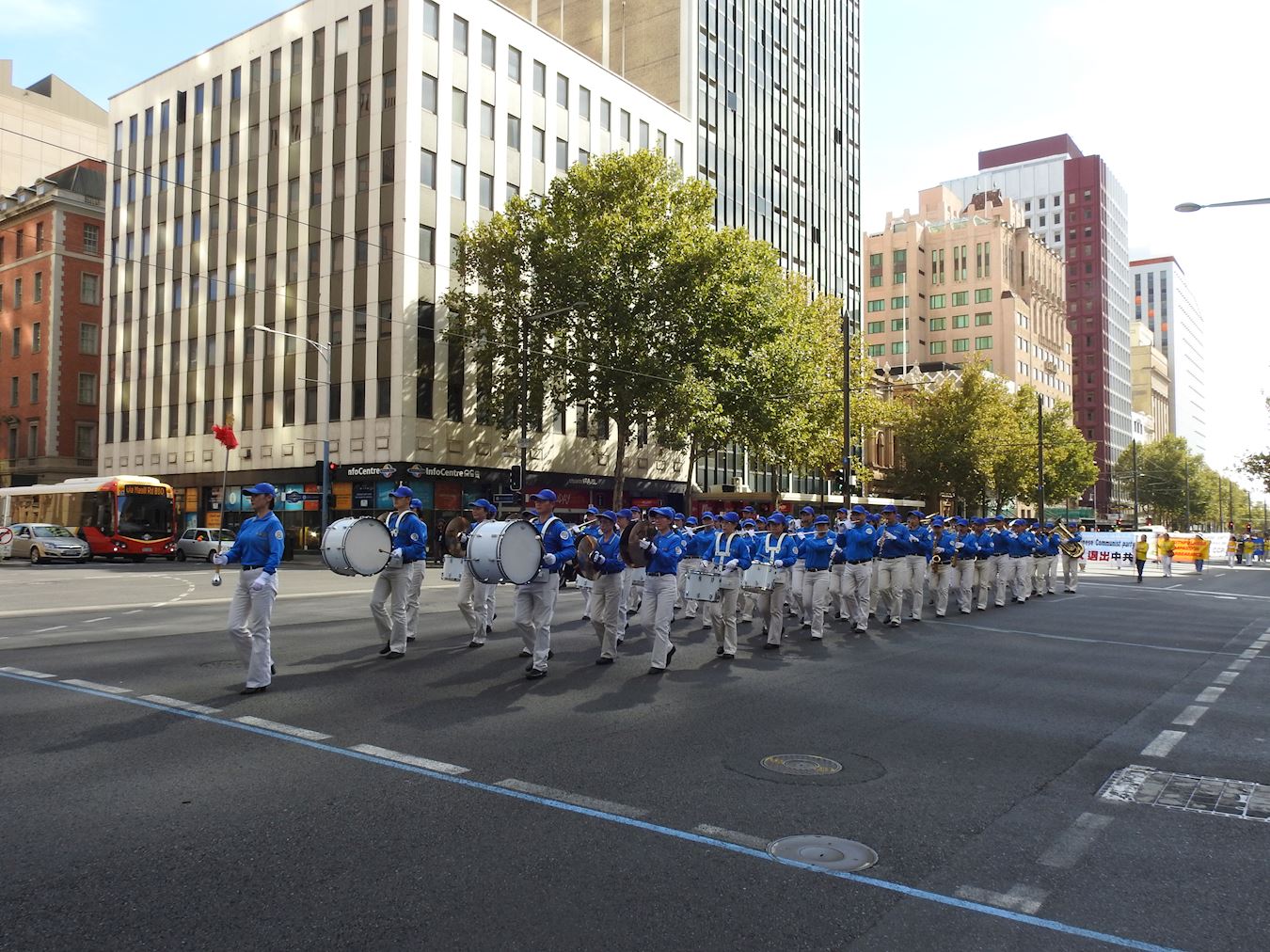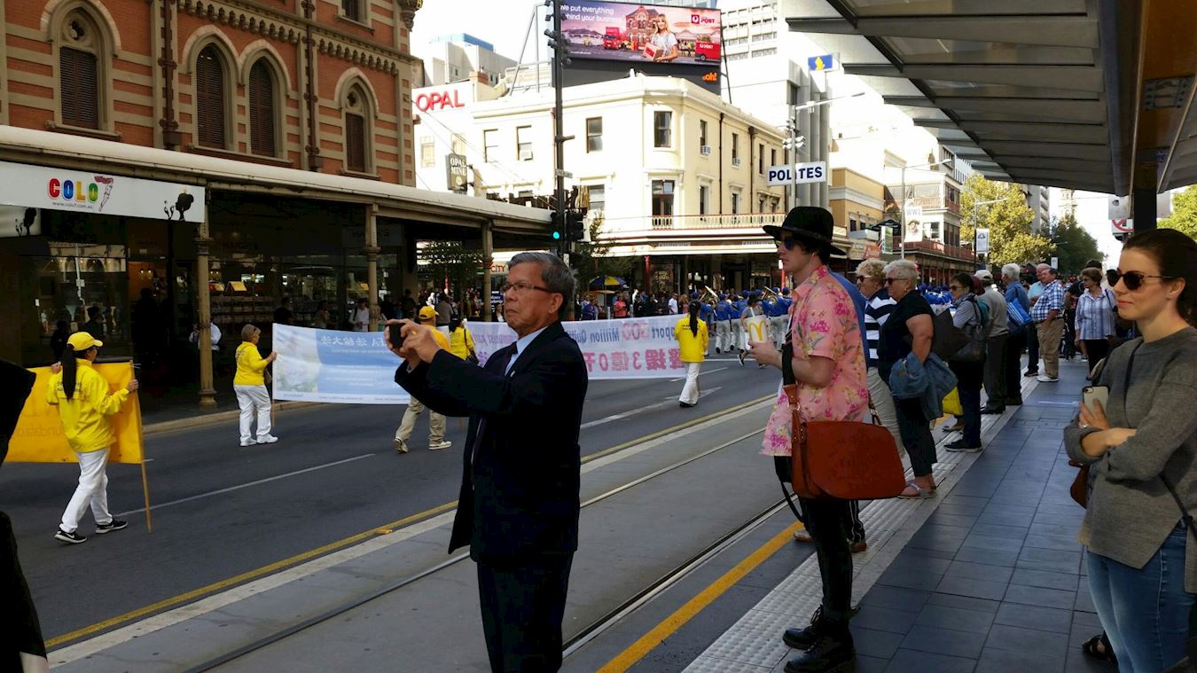 上午十一点,游行从北大街南澳总督府前出发,经市中心威廉王大道,到唐人街结束。当天的游行队伍由“澳洲法轮大法天国乐团”引领,向各界民众展示了以“反迫害”、“声援三:退.”为主题的横幅。