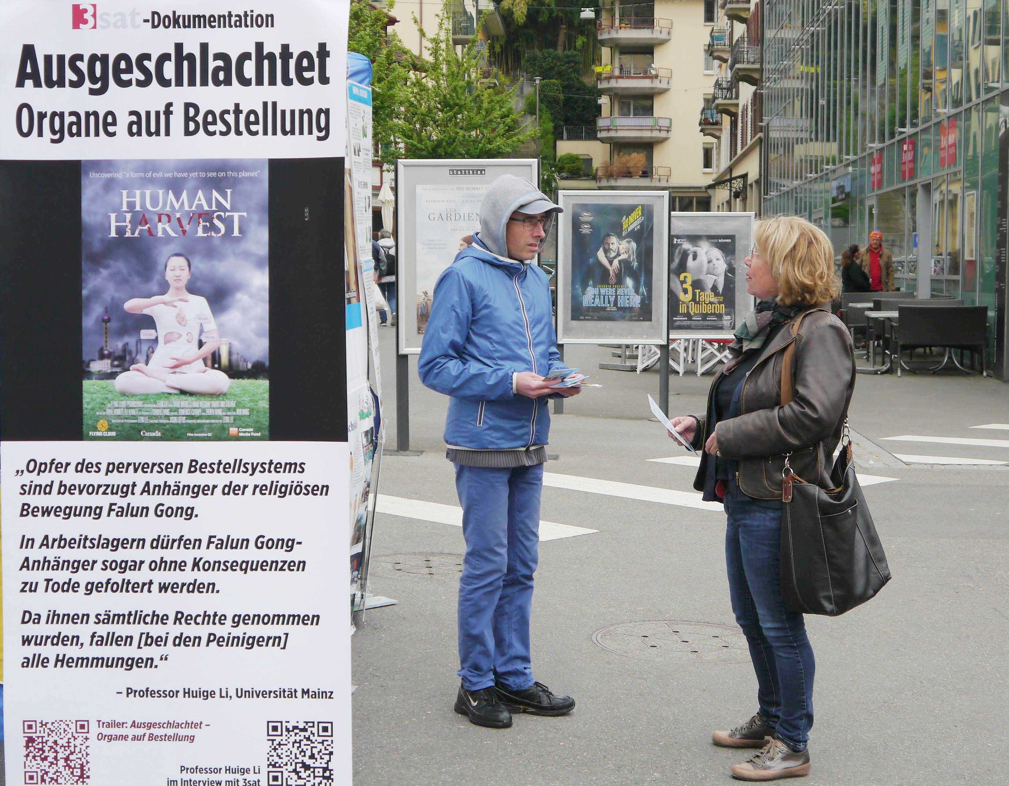 二零一八年五月一日,瑞士法轮功学员在卢赛恩(Lucerne)狮子像附近的狮子广场(Loewenplatz)再次设立了信息摊位,展出内容丰富的中文和德文展板,告诉路人特别是中国游客什么是法轮功,并揭露中共为了诋毁法轮功而散布的种种谎言、诽谤,对法轮功学员的酷刑折磨,甚至活摘法轮功学员器官的罪行。