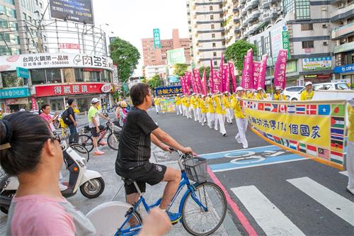 游行前高雄法轮功学员先集合齐声“恭祝师尊生日快乐”,接着展开盛大游行。队伍由三大方阵组成,最前方是“庆祝513世界法轮大法日”横幅,接着在天国乐团庄严雄壮的乐音引领下开始游行,依序有巨大的《转法轮》书模型、大法轮图形、仙女队、“法轮大法好”旗队、“真善忍”旗队、炼功队,最后是腰鼓队压阵。游行队伍井然有序,异彩纷呈,沿路两侧商家、游客、机车骑士纷纷走出或停车观看。