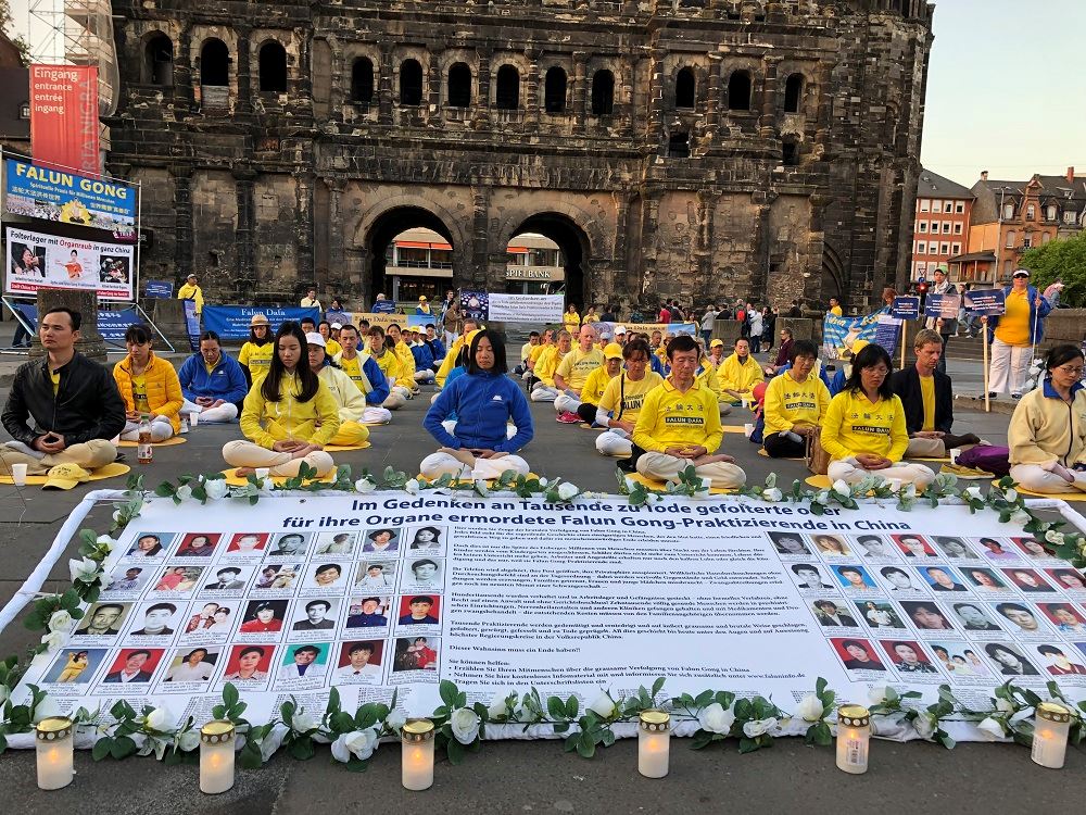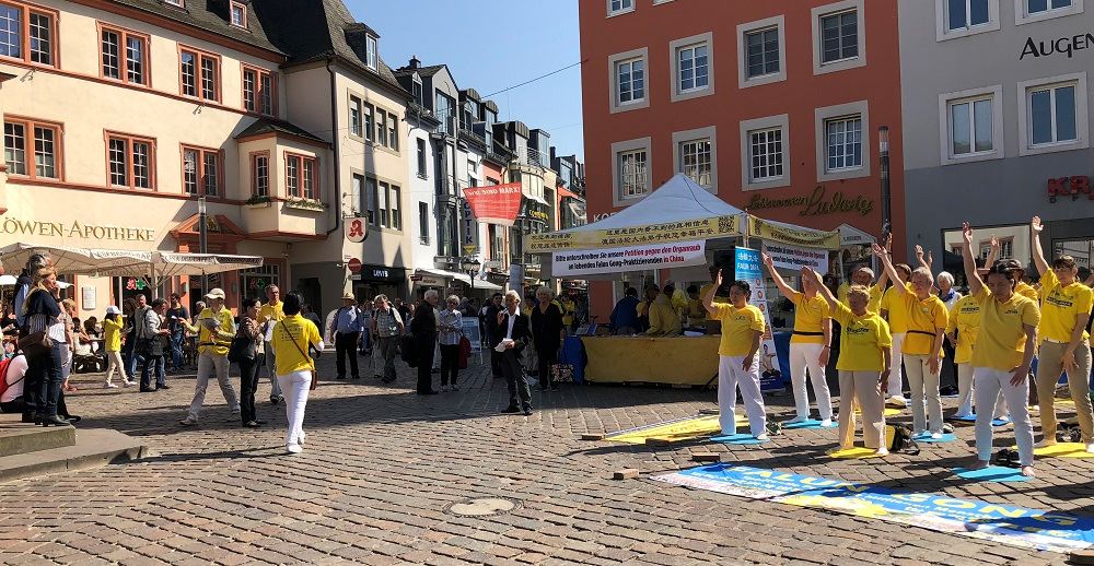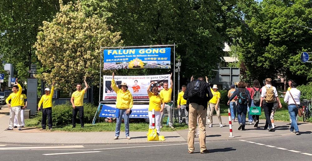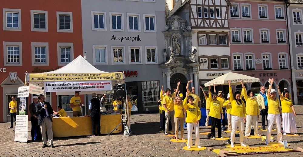 五月四日至六日,德国特里尔市主要的街道、广场到处可见身着黄色上衣的法轮功学员。他们举行和平集会,抗议中共对法轮功长达十九年的迫害,也有学员在舒缓的音乐声中展示功法,或者三三两两穿行于人群之中和本地市民或外地游客交谈,讲马克思共产主义百年红祸真相,还有法轮功学员给中国人讲真相全“三:退.”。