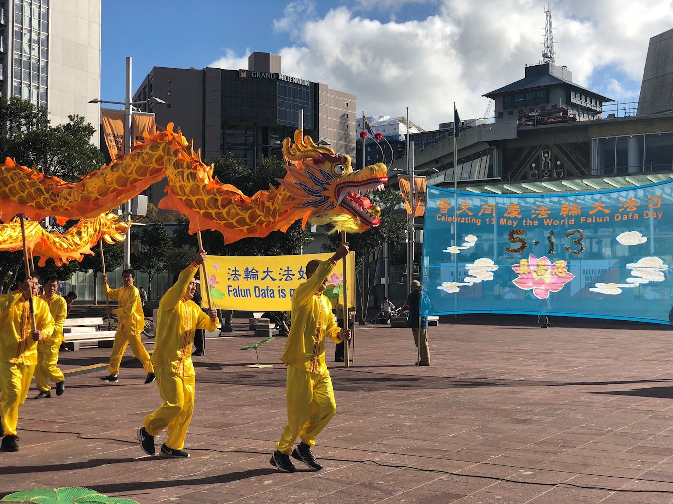 '图1:新西兰奥克兰Aotea广场,法轮功学员集会庆祝世界法轮大法日。'