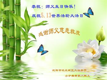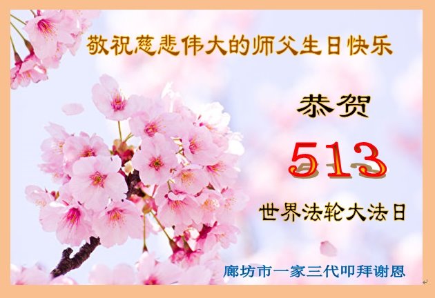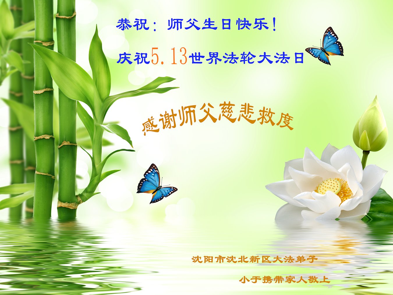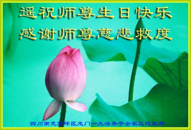 在这普天同庆的日子里,我们全家深深的叩谢大法师父洪恩浩荡、慈悲救度、福泽我们全家每一个成员!我们明白真相后,支持家人修炼,做事越来越顺。虽然我们没修炼,但是我们心里每天都念法轮大法好!盼望您早回来。再次恭祝李大师生日快乐!跪拜!合十