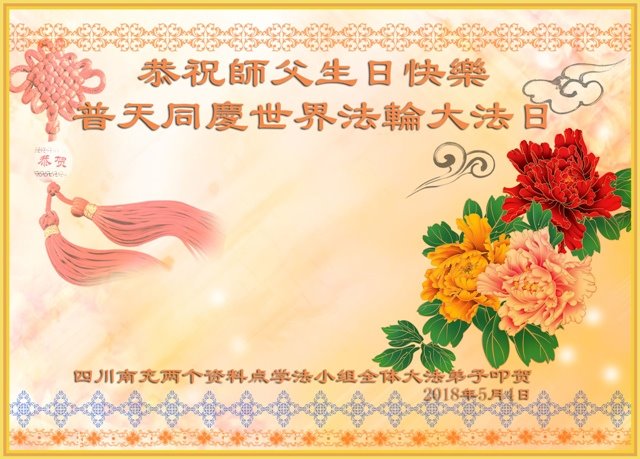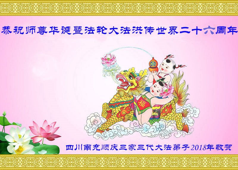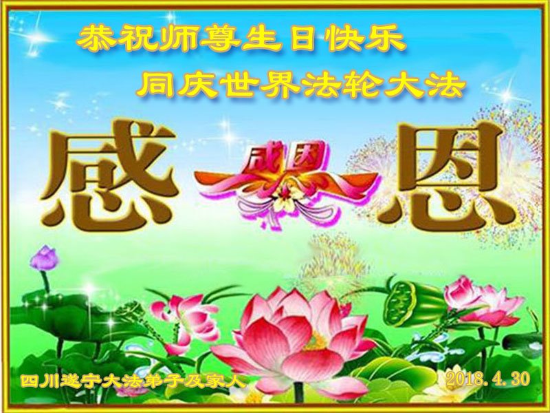 恭贺师尊华诞暨世界法轮大法日!在普天同庆世界第十九届法轮大法日的神圣节日里,巴中市巴州区全体大法弟子携明白真相的本地众生以无比感恩、崇敬的心恭祝慈悲伟大的师尊华诞愉悦!师父辛苦了!师父啊,您以无量慈悲救度弟子和众生,把亘古未传的能使穹宇生命得以更新的法轮大法洪传于世,归正天地苍生;您以博大的襟怀不计众生过往之过,忍辱负重、历尽沧桑,并几乎耗尽所有,精妙绝伦的安排着法徒与众生返本归真之路。