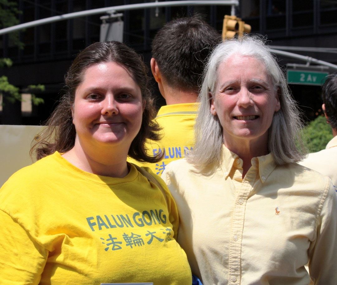 ![]() 图:来自费城的西人法轮功学员珍妮·希克斯(Jennie Sheeks)(左)参加二零一四年纽约举办的世界法轮大法日游行 |