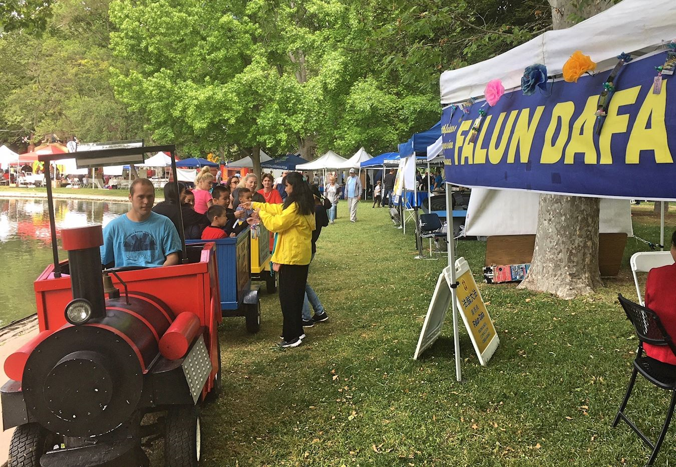 当天,法轮功学员在公园内设立了展位,为前来参加的家长和小朋友准备了大法的真相资料,并教小朋友们折纸莲花。学员们一边教小朋友折纸莲花,一边告诉他们法轮大法是以“真、善、忍”为原则,指导修炼者在日常生活中按照此原则为人处事,使修炼者身心获得提升。家长们和年龄比较大的小朋友都很认同。