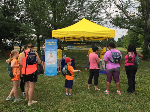 ![]() 图1~2:法轮功学员在户外运动节上向民众介绍功法 |