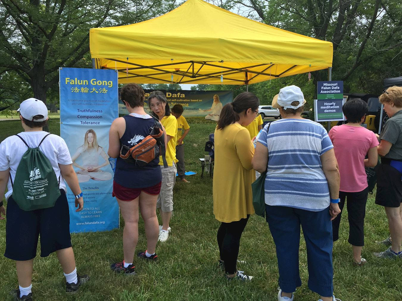和往年一样,许多人都对法轮功功法很感兴趣,在展位前停下询问信息的人络绎不绝。很多人表示观看学员们的功法演示让他们感受到祥和与平静。