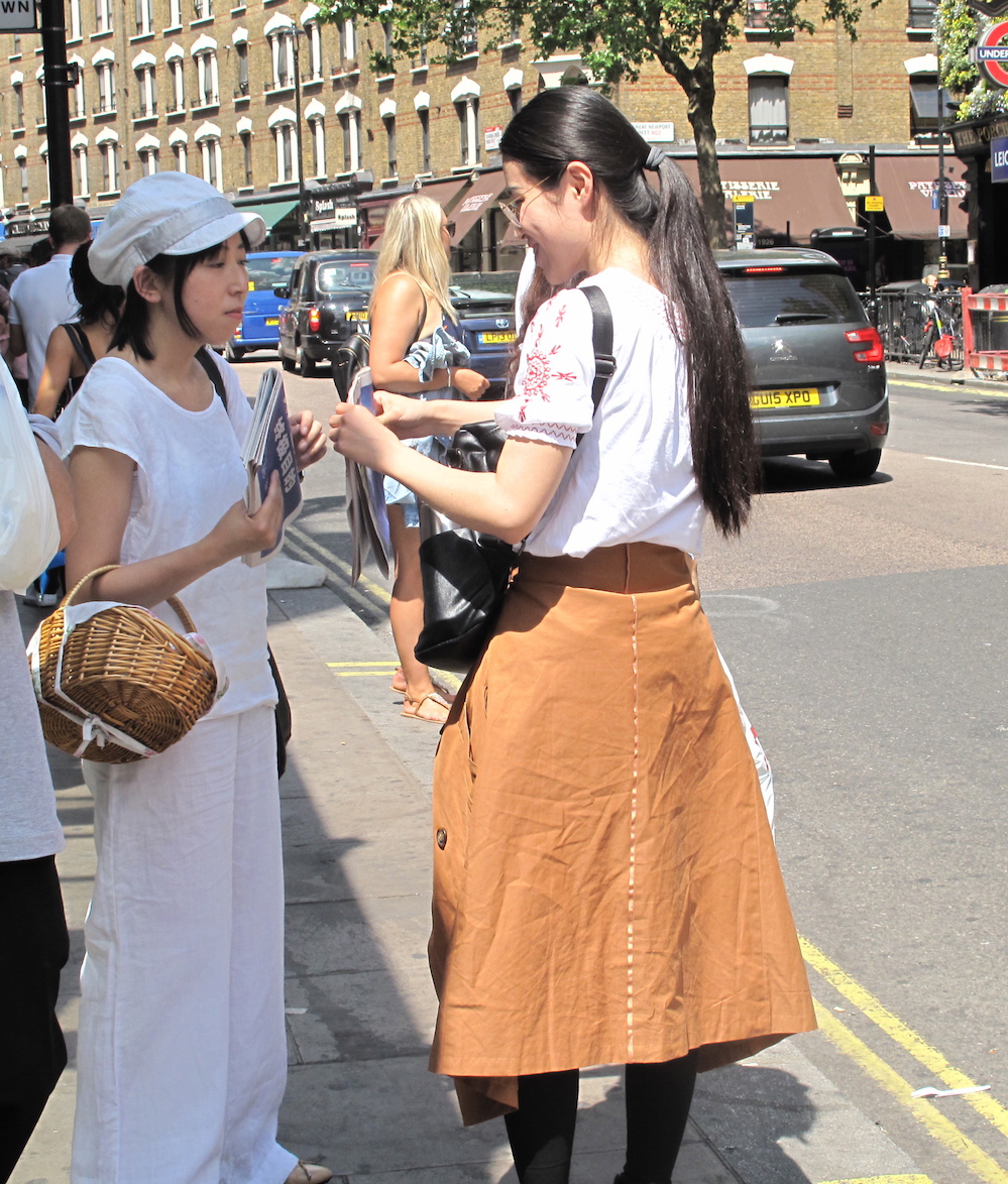 ![]() 图1:二零一八年六月三日,跟随法轮功反迫害游行队伍,英国法轮功学员铭慧(左)在伦敦唐人街地带向路人讲真相 |