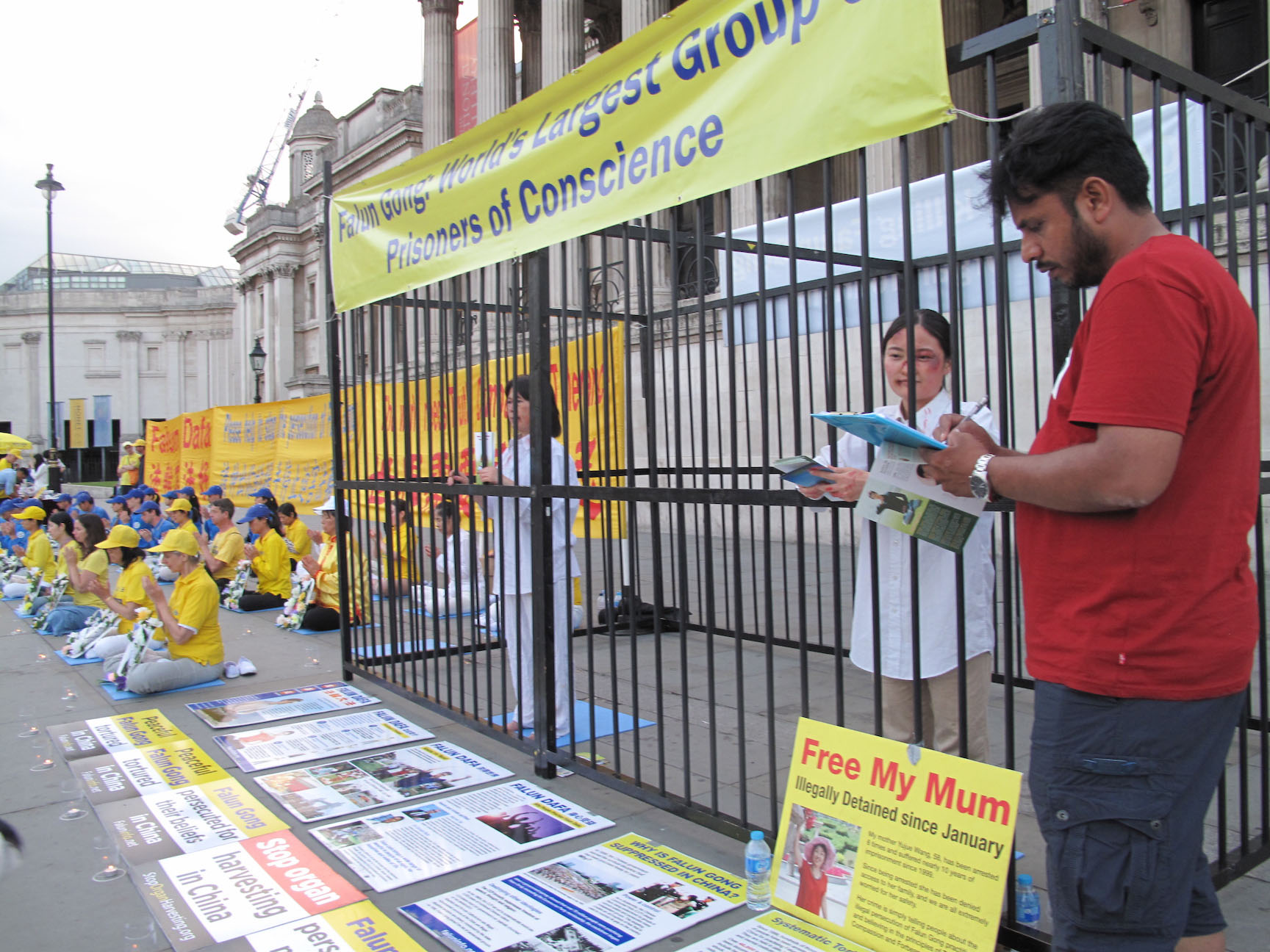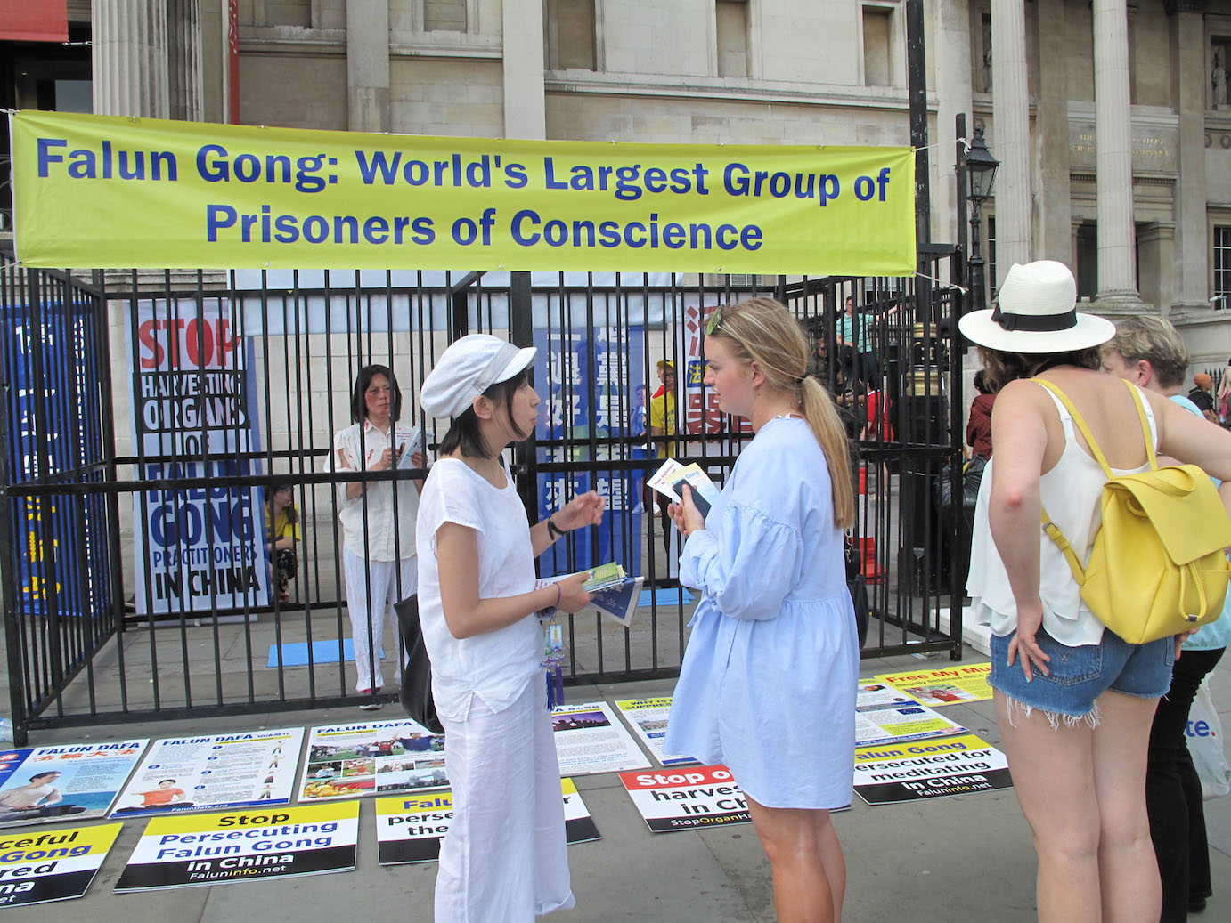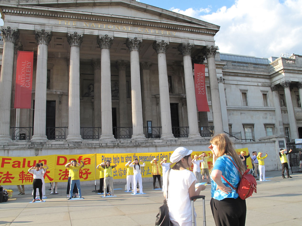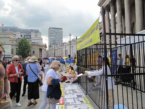 二零一八年六月三日,在伦敦特拉法加广场,住在北英格兰、在星巴克公司工作的尼基•贝尔(Nicky Bell)女士,六月二日来伦敦参加一个节日庆祝活动,第二天在特拉法加广场遇到了法轮功,她告诉向她讲真相的法轮功学员铭慧:“我以前没听说过法轮功”,“我要在请愿书上签字。”
