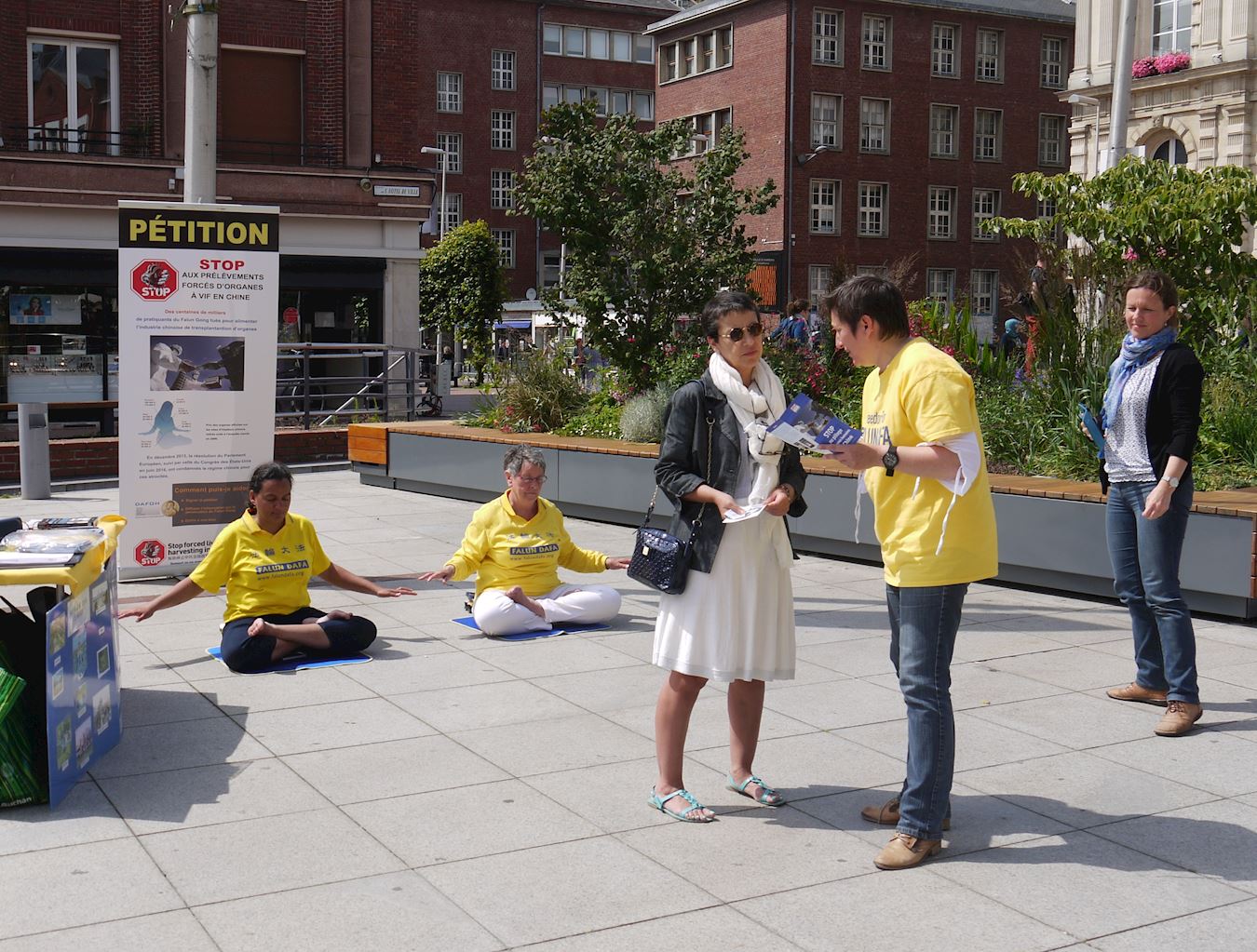 这一天天气晴朗,微风吹拂,市政府广场前的步行街人流来往不断。法轮功学员通过喇叭介绍功法,人们听说法轮功是佛家高层修炼方法,便停下脚步,观看功法演示,与此同时,他们也得知法轮功在中国无辜遭受残酷迫害。人们难以置信,这样一个祥和的修炼功法,对人有很大的好处,却遭到中共的禁止。他们纷纷在反迫害征签表上签字,表达对法轮功的支持。
