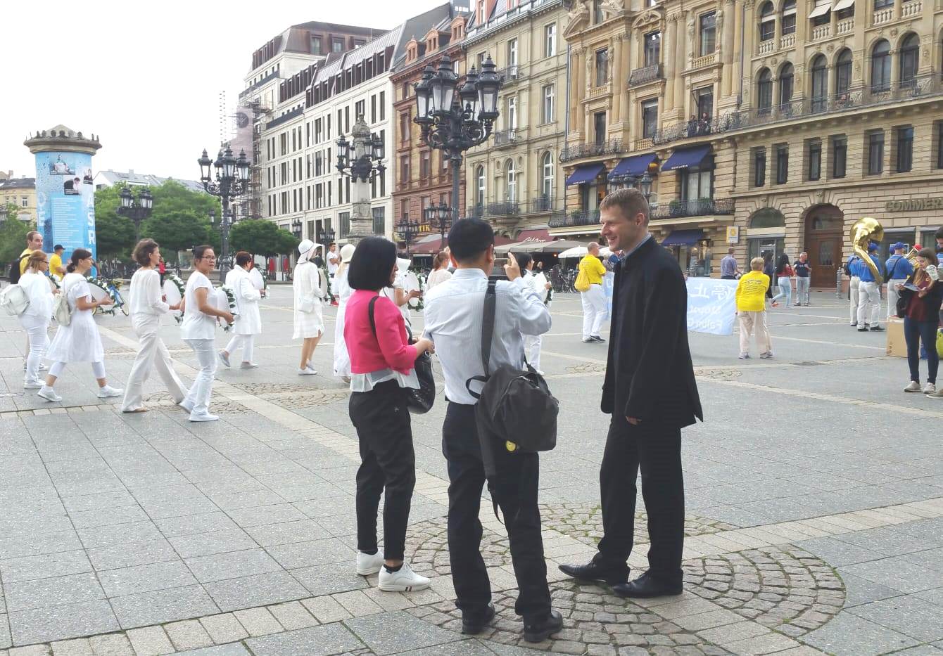 六月十五日星期五下午四点左右,欧洲法轮功学员组成的天国乐团在市中心的游行和随后在保罗广场(Paulplatz)的演奏,吸引的大量游客,特别是大陆游客的注意力。乐团雄壮的音乐,整齐的队伍和法轮功学员言行举止中所散发出的真、善、忍风貌给他们留下深刻印象。乐团后方的一组身着白衣的学员与乐队稍稍拉开距离,手持镶有亡者照片的花环,默默为被中共迫害致死的同修们哀悼。一动一静,一前一后穿过熙熙攘攘的市区,吸引路人的目光。不少华人在了解法轮功真相后声明退出中共的党、团、队。在一个法轮功学员那里就有十几个中国人做了三:退.。