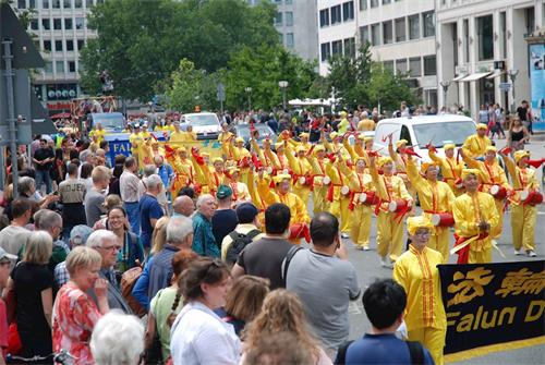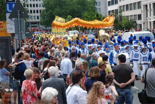 ![]() 图1~6:二零一八年六月十六日,法轮功学员组成的队伍在德国法兰克福市中心举行的第十一届多元文化节游行中,受到两旁观众的欢迎。 |