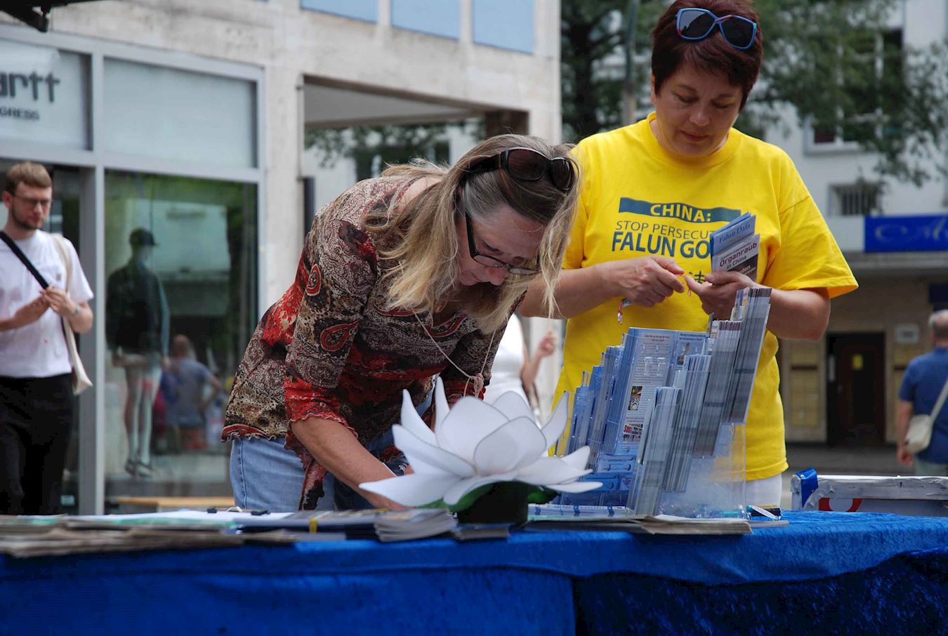 一位约三十岁的年轻人和他母亲路过,母亲让他接过传单,看他不明所以的样子,边上的学员告诉他法轮功是什么以及正在中国发生的迫害,他听说中共活摘器官的事后非常吃惊,问他能做些什么。走去签名时,这位年轻人对学员表示,(在这样的迫害面前)他完全说不出话来了。随后他的父亲和太太也来了。除了那位年轻人,其他家人都不懂德语。那位父亲在读了法语的传单后露出非常感兴趣的样子,并对学员竖起了大拇指。