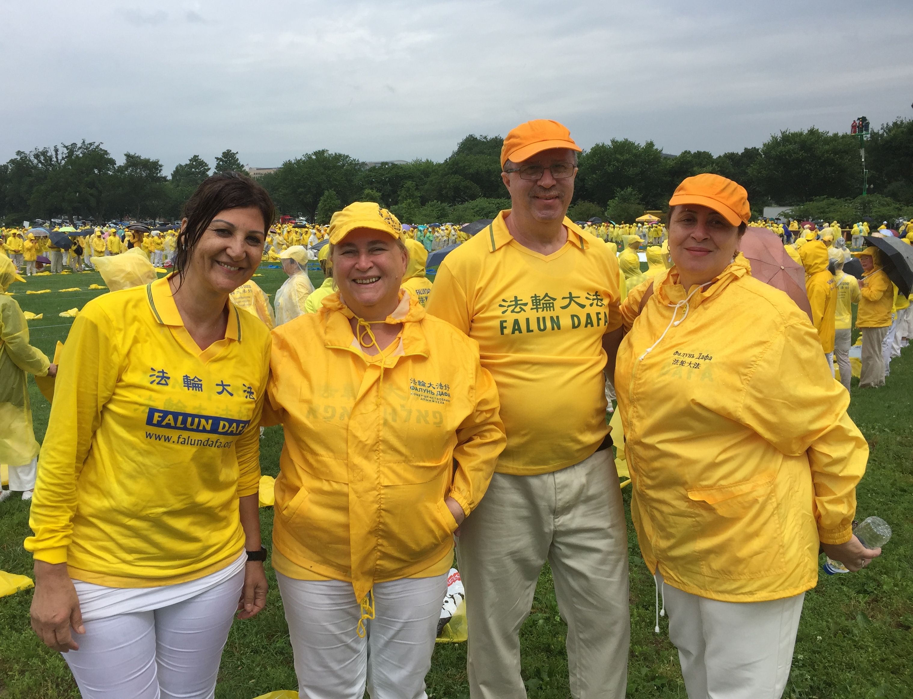 图3:来自以色列的法轮功学员迈克(Micheal,右二)与妻子(右一)和其他以色列学员冒雨参加了二零一八年六月二十二日在美国华盛顿的大型排字活动。(容法/明慧)